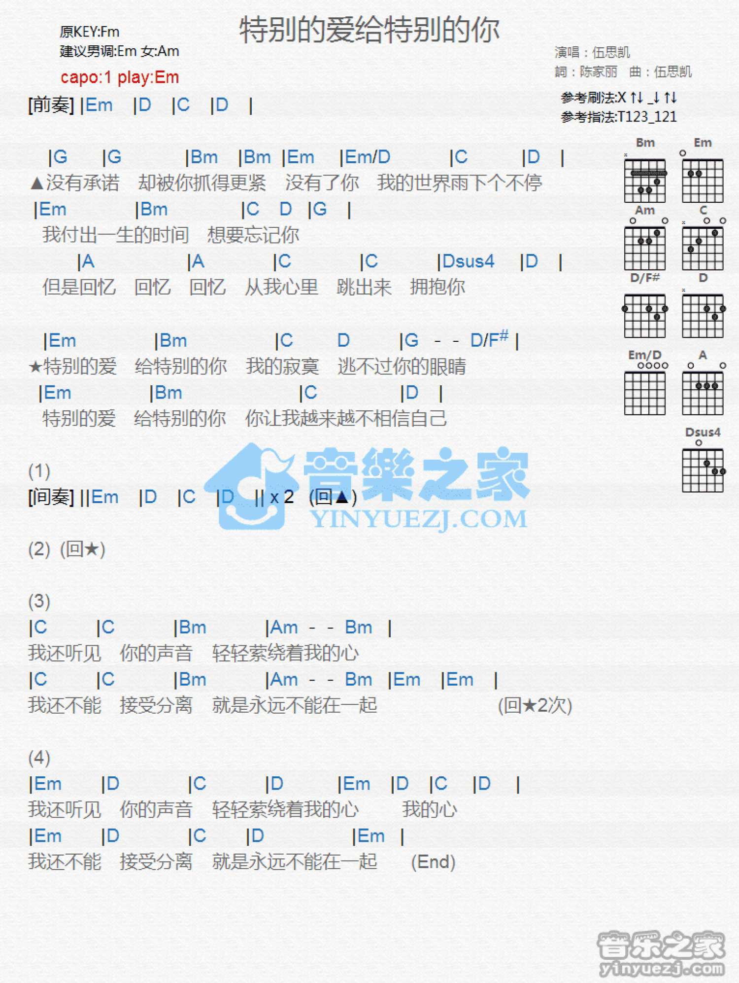 曲谱介绍: Em调版伍思凯《特别的爱给特别你》吉他和弦弹唱谱