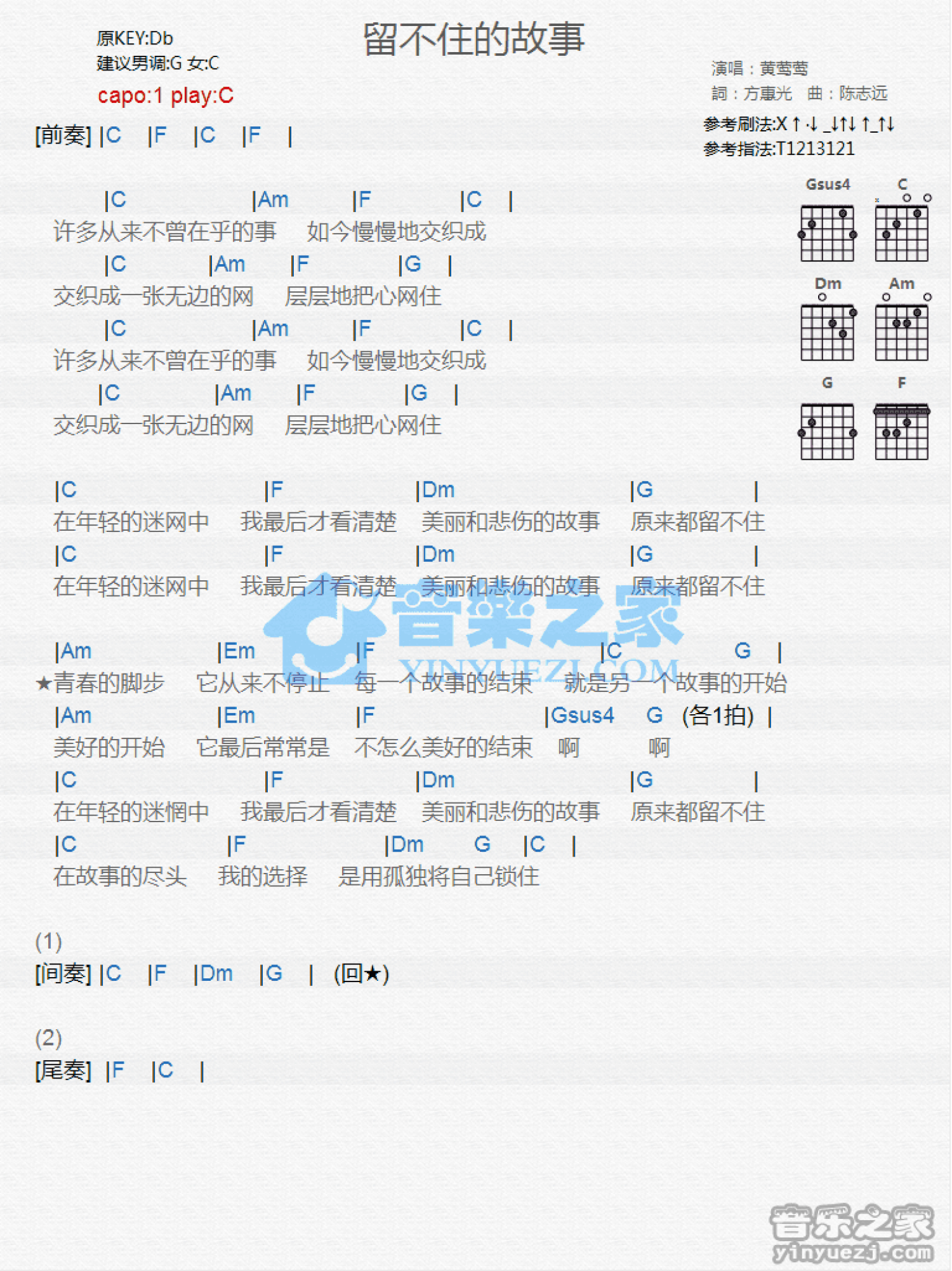 曲谱介绍: C调版黄莺莺《留不住的故事》吉他和弦弹唱谱