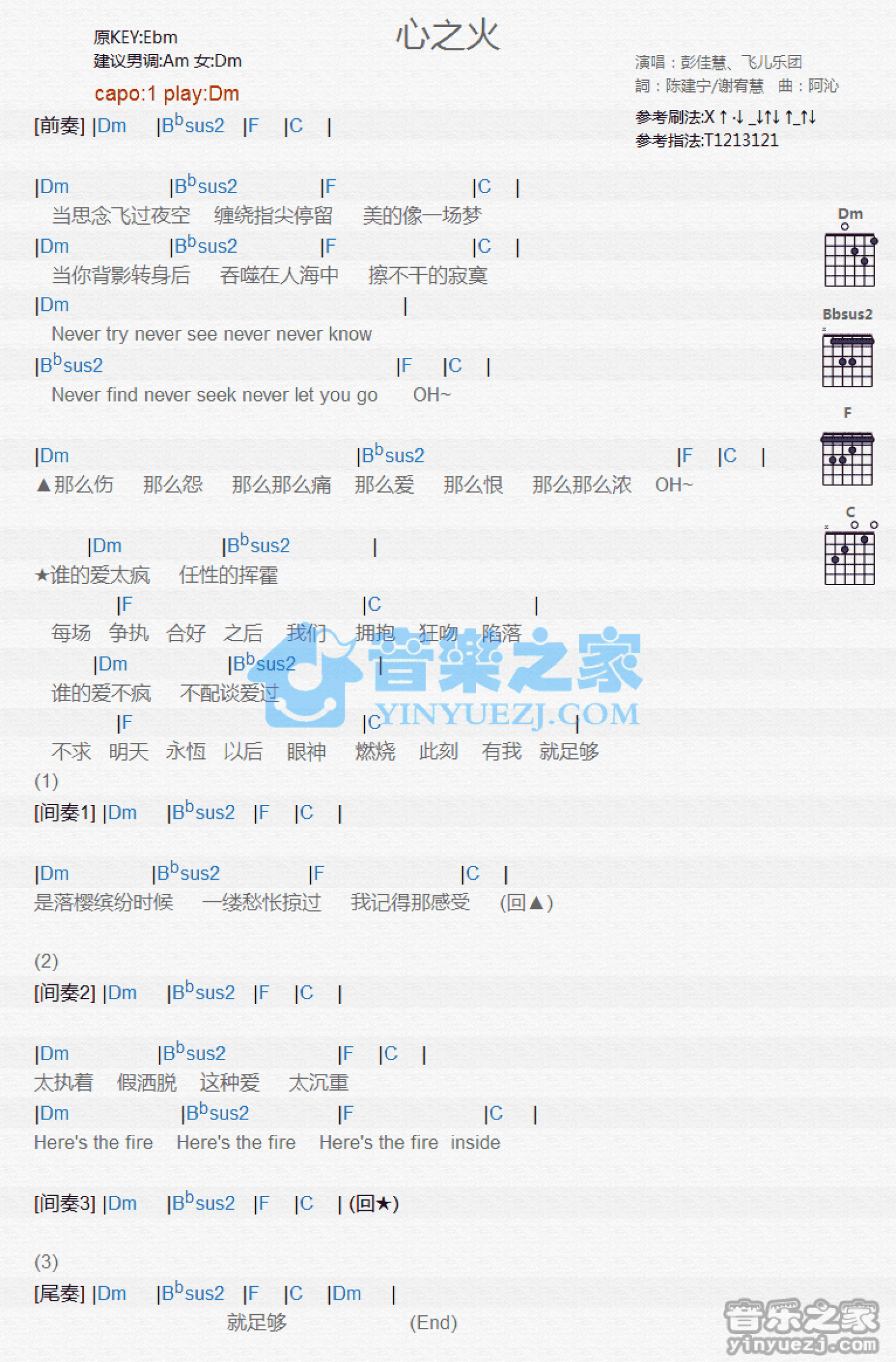 曲谱介绍: Dm调版彭佳慧/飞儿乐团《心之火》吉他和弦弹唱谱