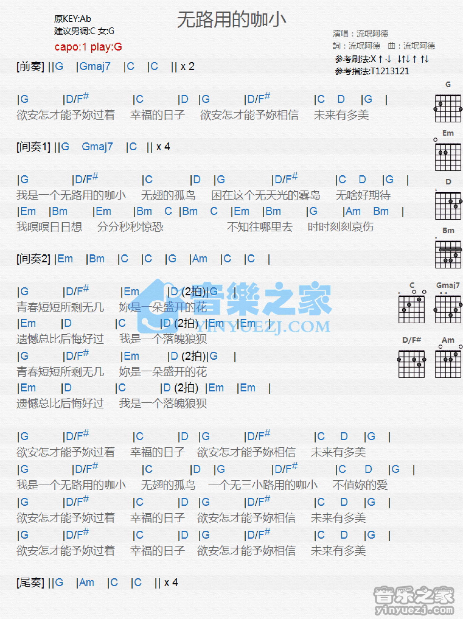 曲谱介绍: G调版《无路用的咖小》吉他和弦弹唱谱