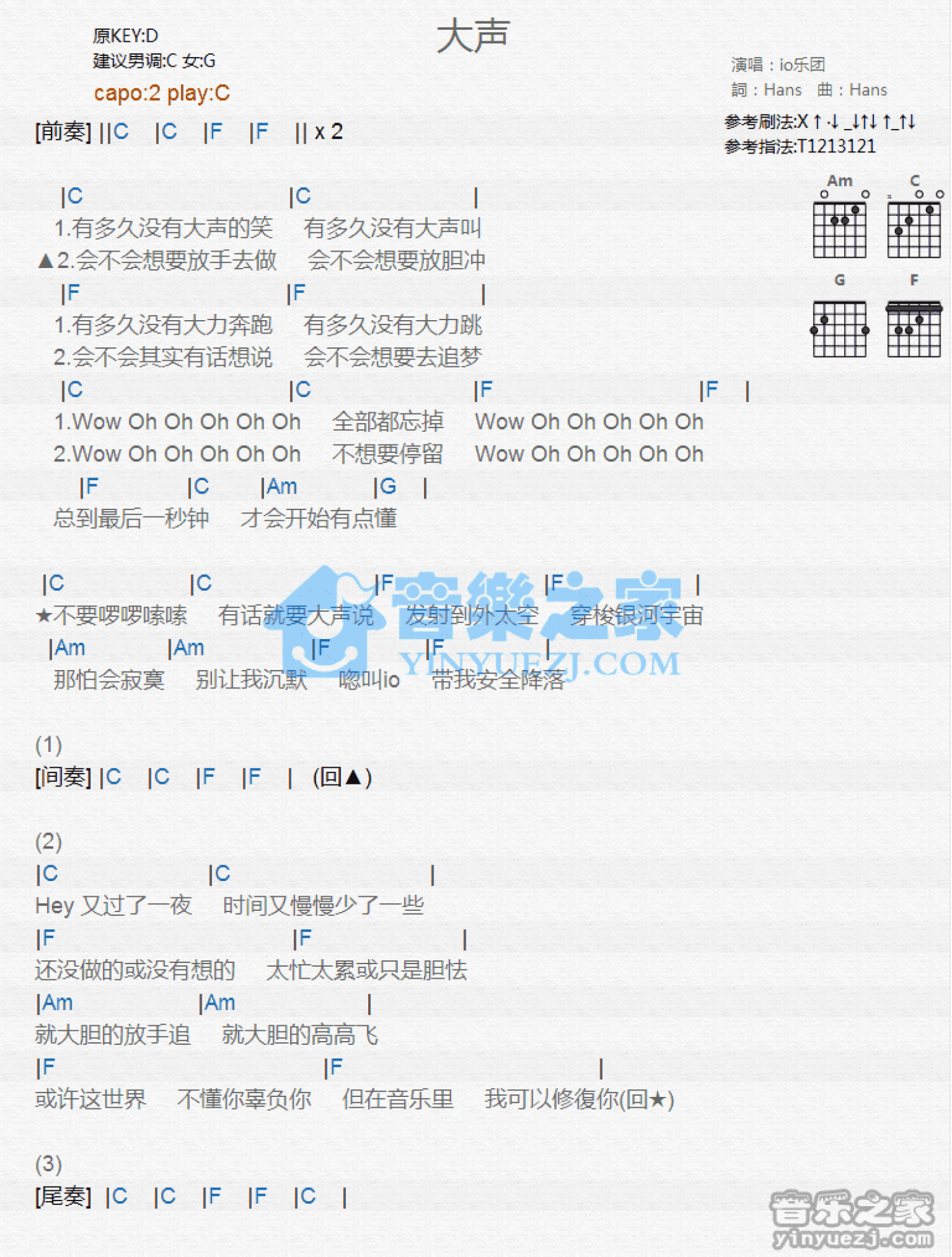 曲谱介绍: C调版io乐团《大声》吉他和弦弹唱谱