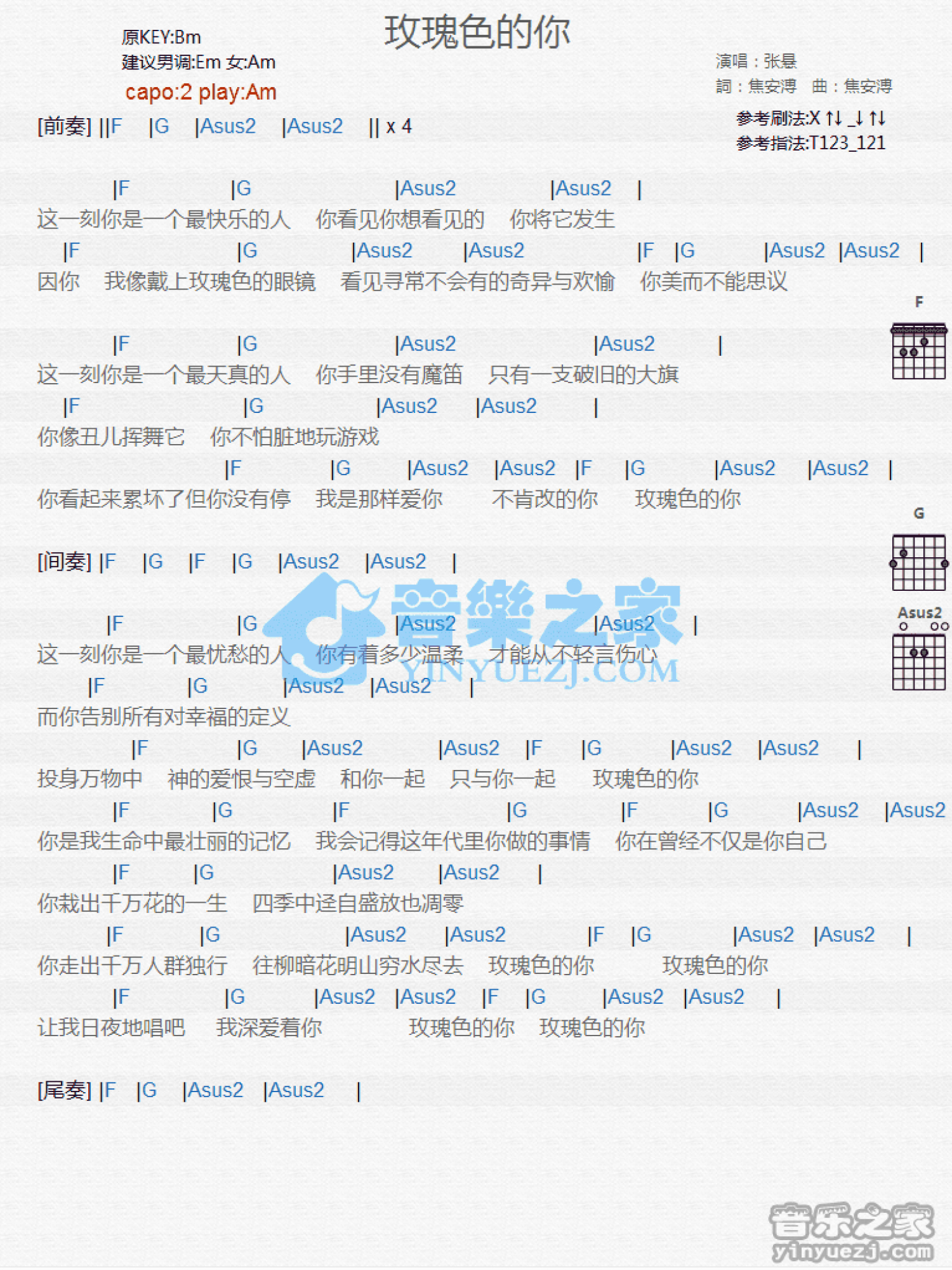 曲谱介绍: Am调版张悬《玫瑰色的你》吉他和弦弹唱谱