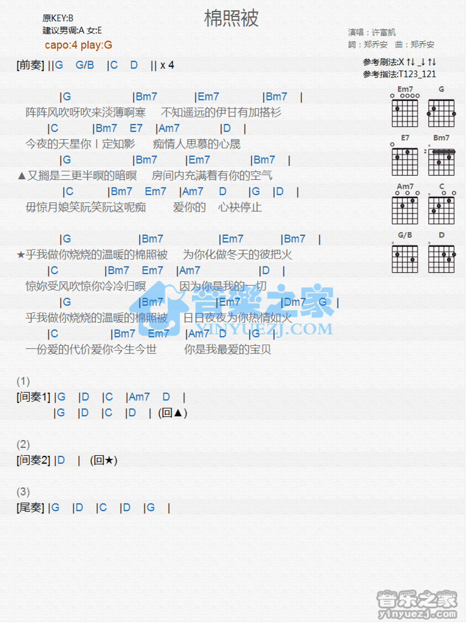 曲谱介绍: G调版许富凯《棉照被》吉他和弦弹唱谱