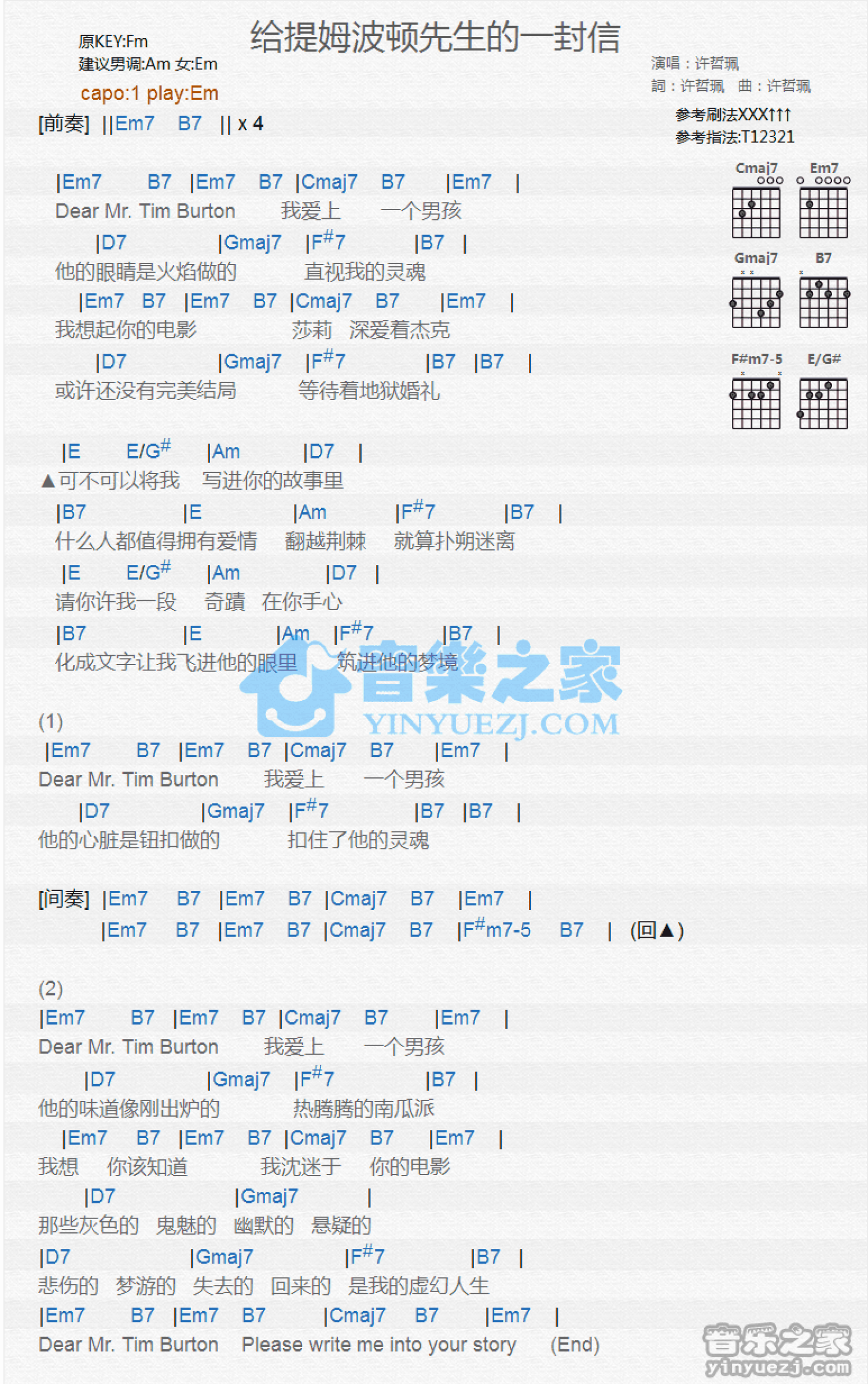 曲谱介绍: Em调版许哲《给提姆波顿先生的一封信》吉他和弦弹唱谱