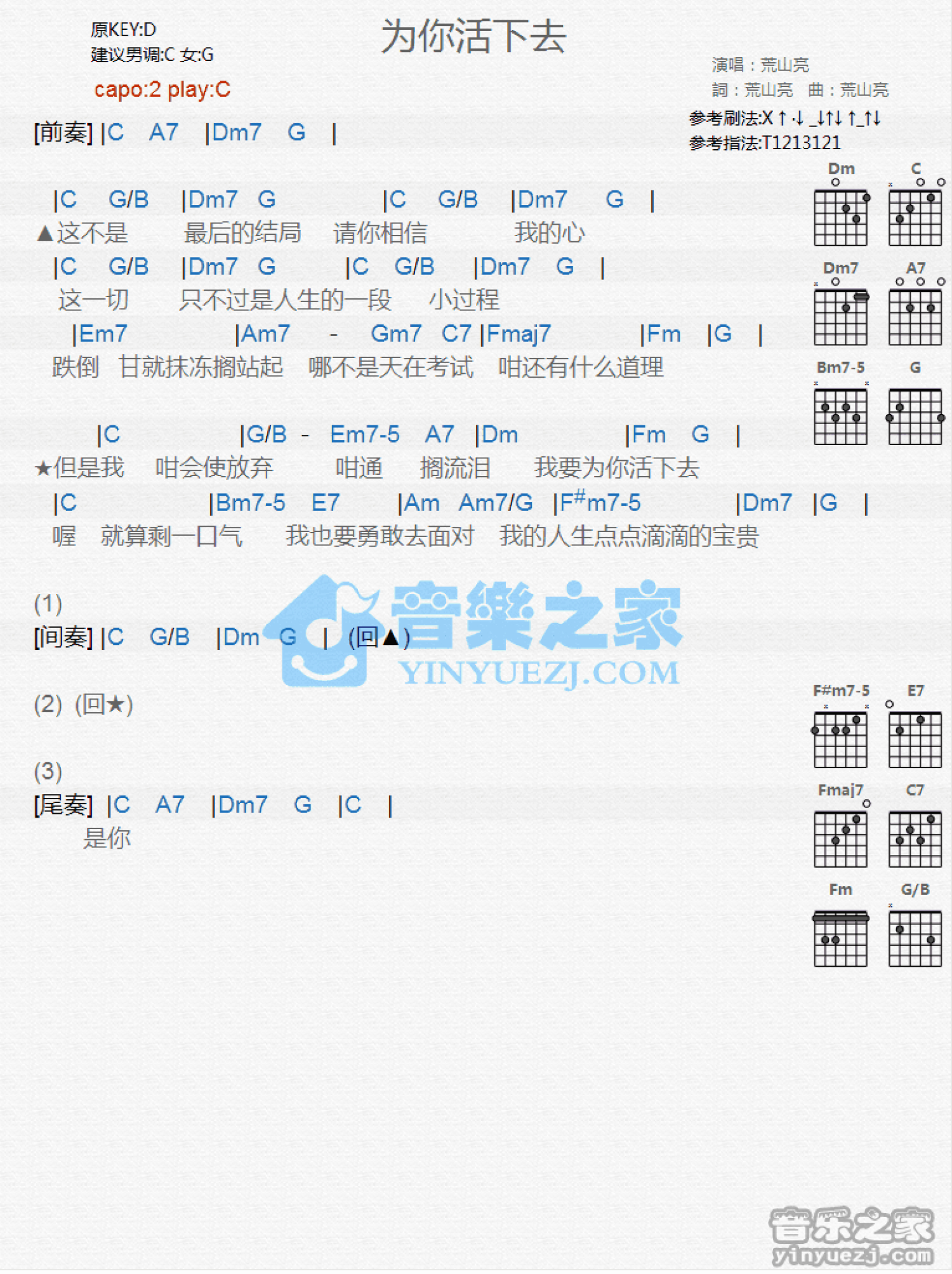 曲谱介绍: C调版荒山亮《为你活下去》吉他和弦弹唱谱