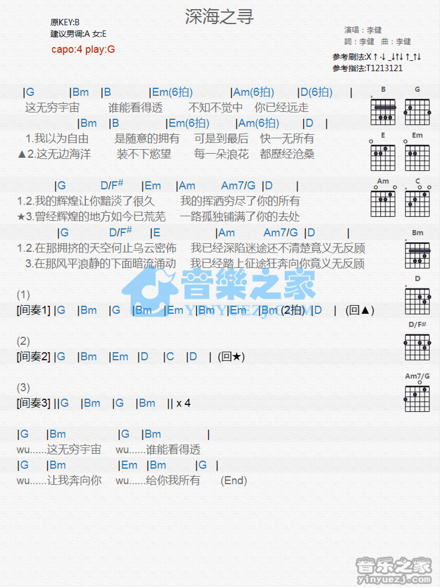 曲谱介绍: G调版李健《深海之寻》吉他和弦弹唱谱