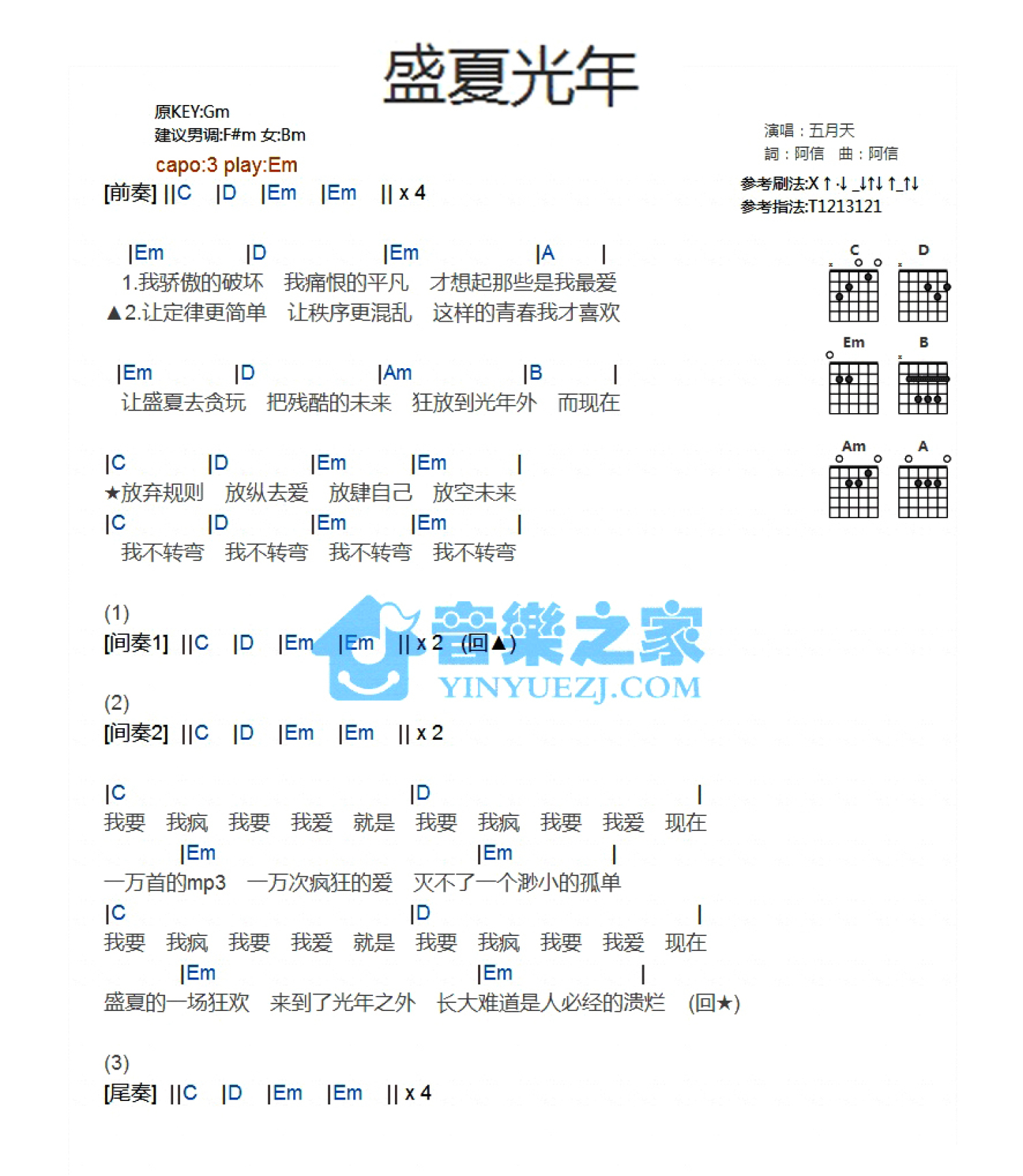曲谱介绍: Em调版五月天《盛夏光年》吉他和弦弹唱谱