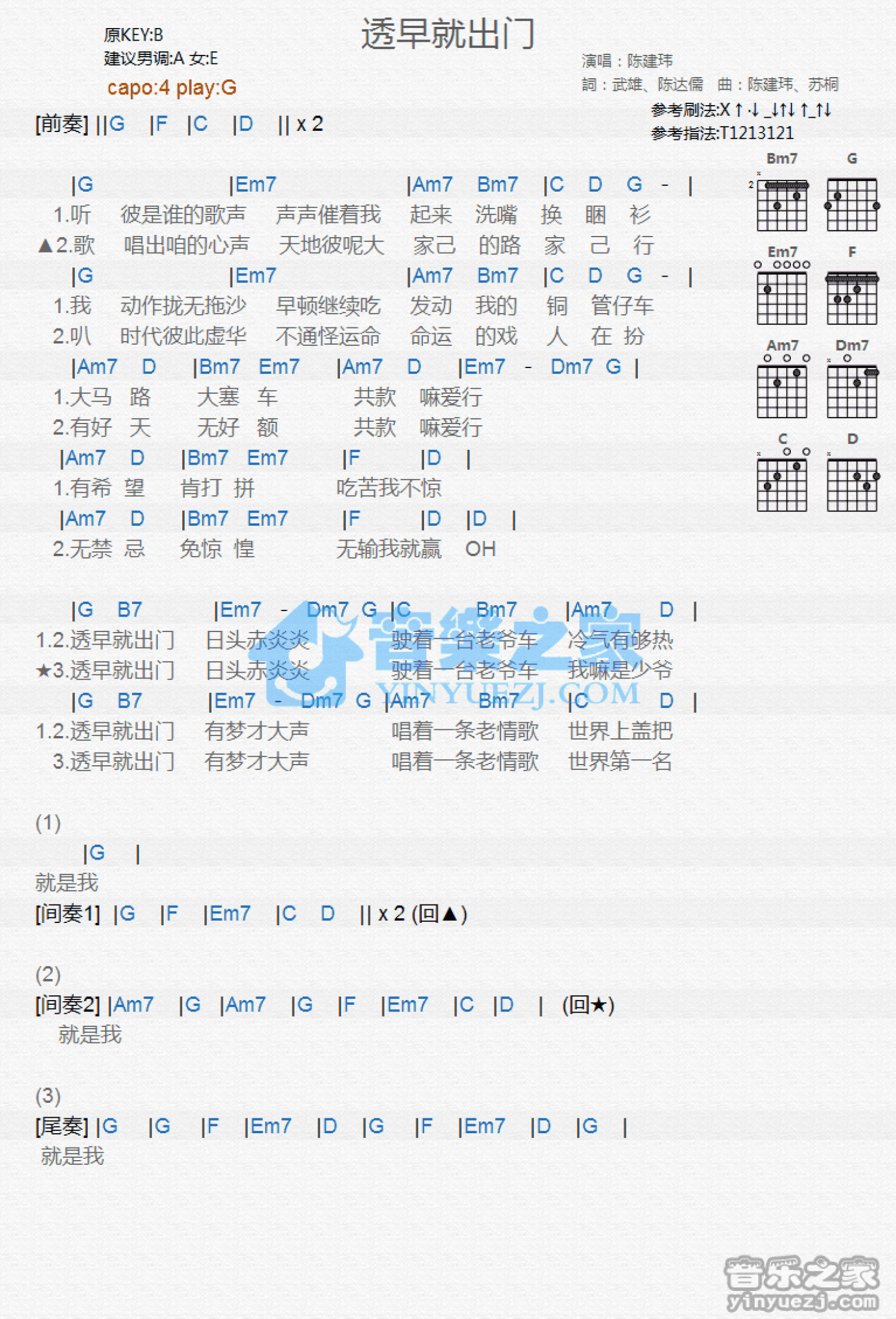 曲谱介绍: G调版陈建玮《透早就出门》吉他和弦弹唱谱