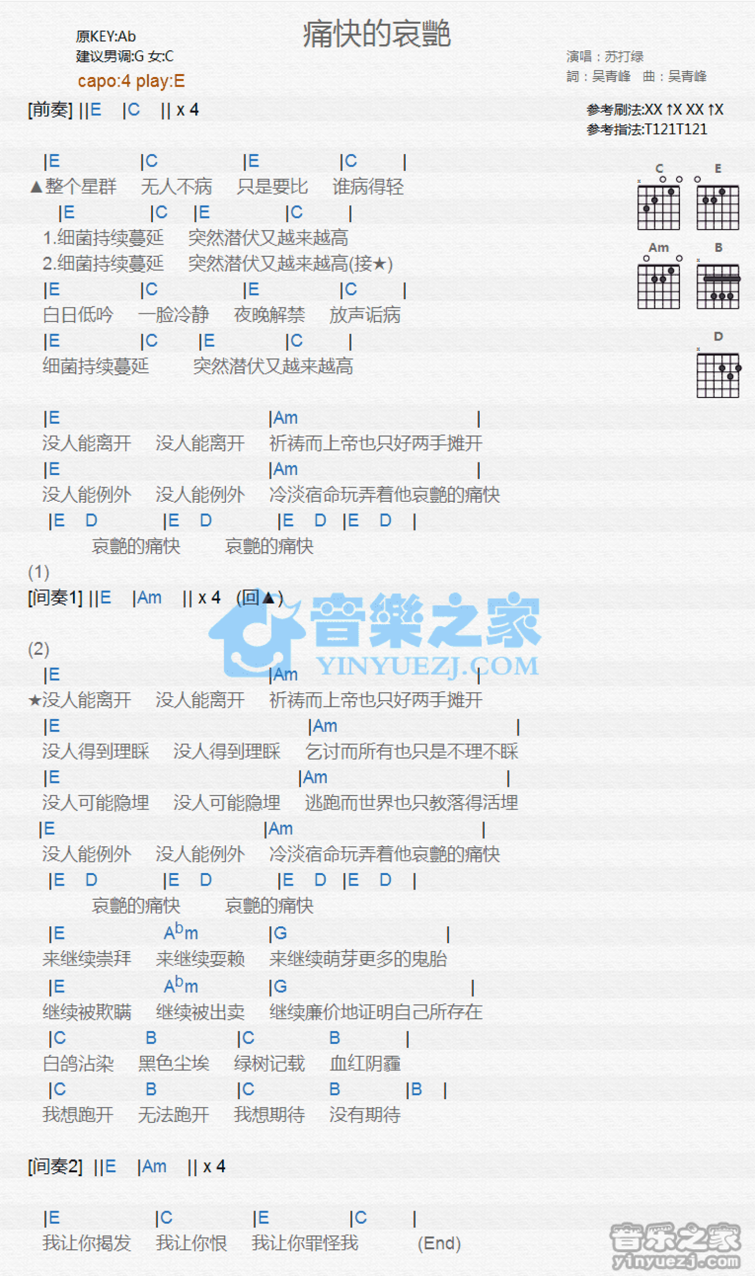 曲谱介绍: E调版《痛快的哀艳》吉他和弦弹唱谱