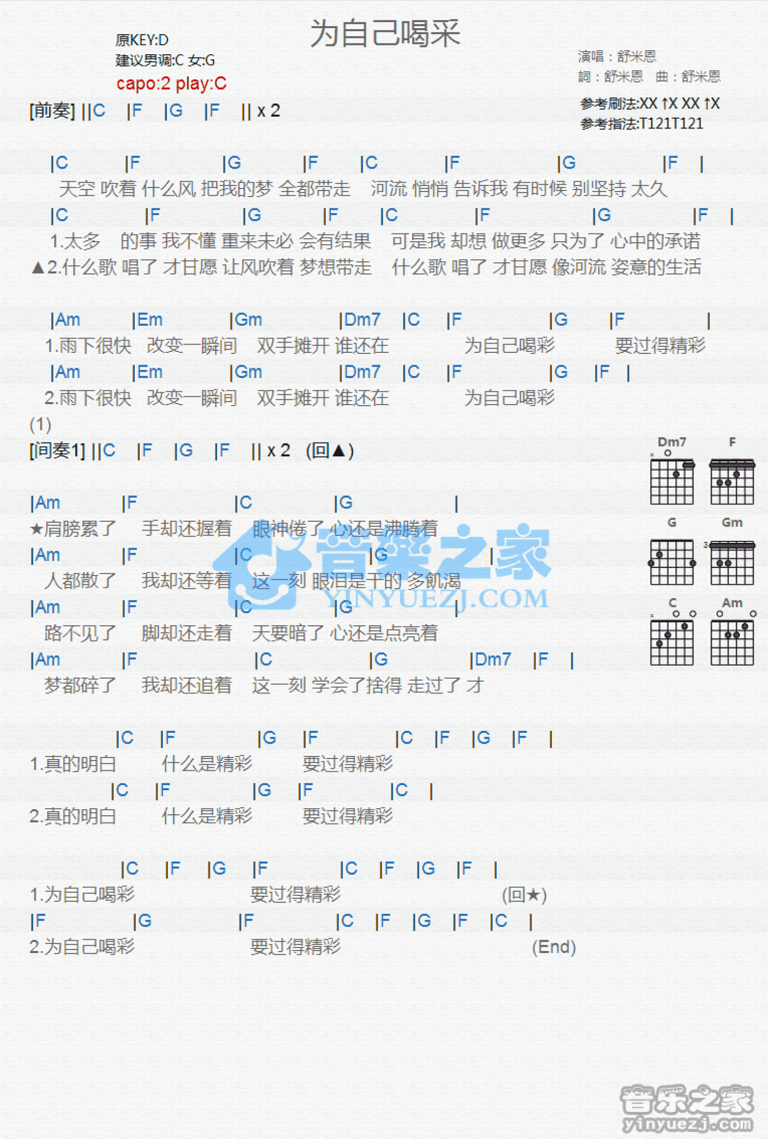 曲谱介绍: C调版舒米恩《为自己喝彩》吉他和弦弹唱谱