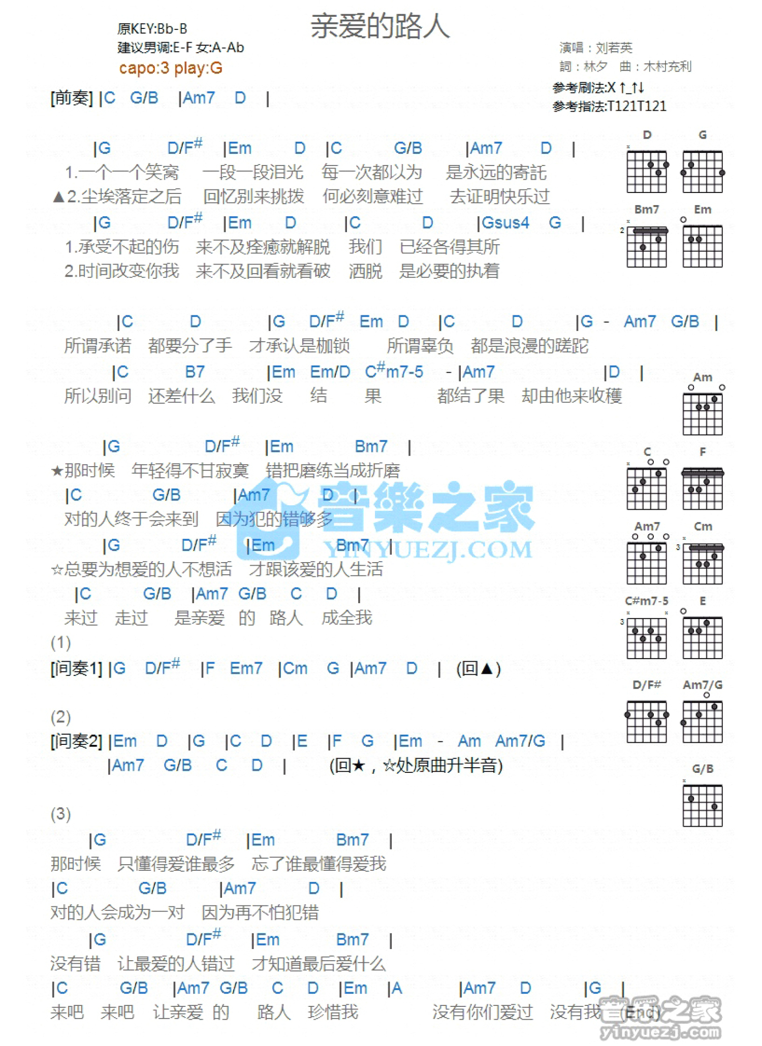 曲谱介绍: G调版《亲爱的路人》吉他和弦弹唱谱