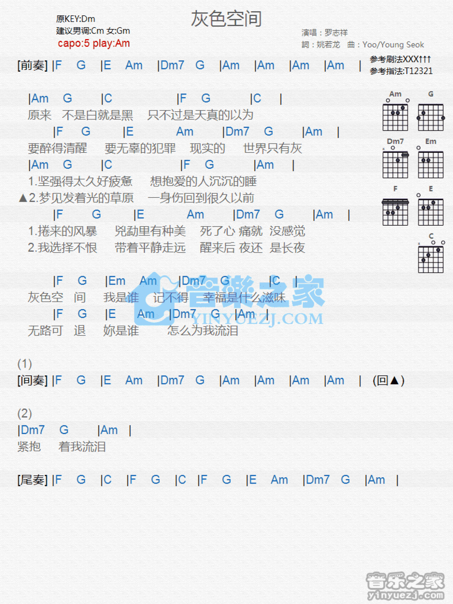 曲谱介绍: Am调版罗志祥《灰色空间》吉他和弦弹唱谱