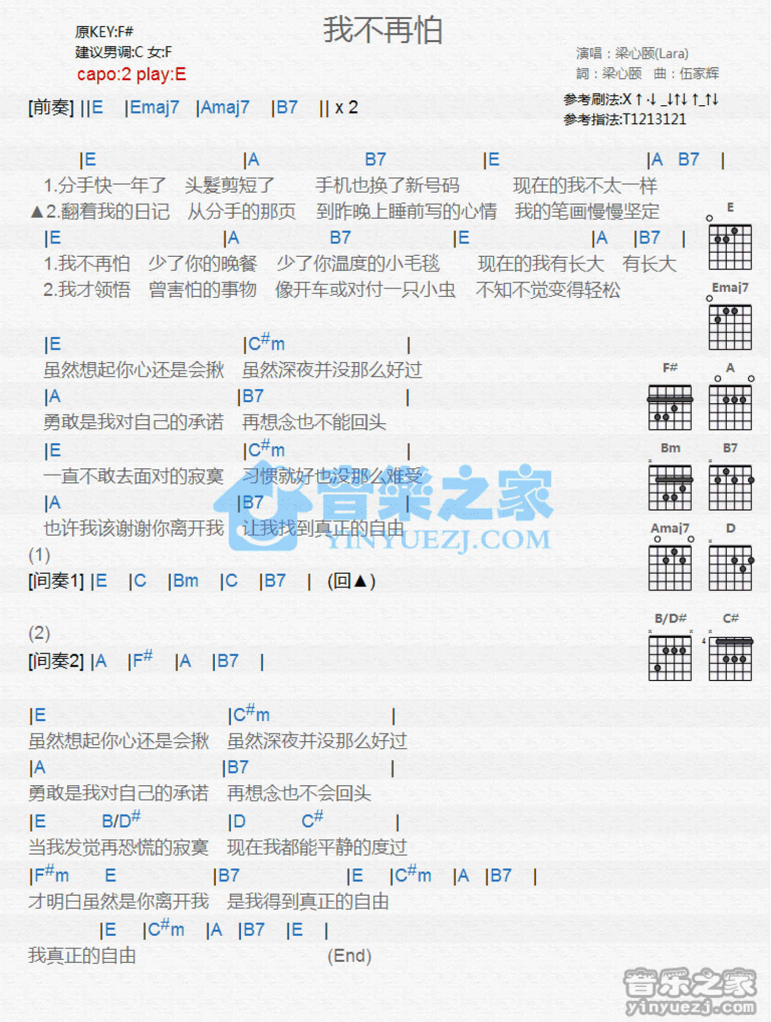 曲谱介绍: E调版梁心颐《我不再怕》吉他和弦弹唱谱