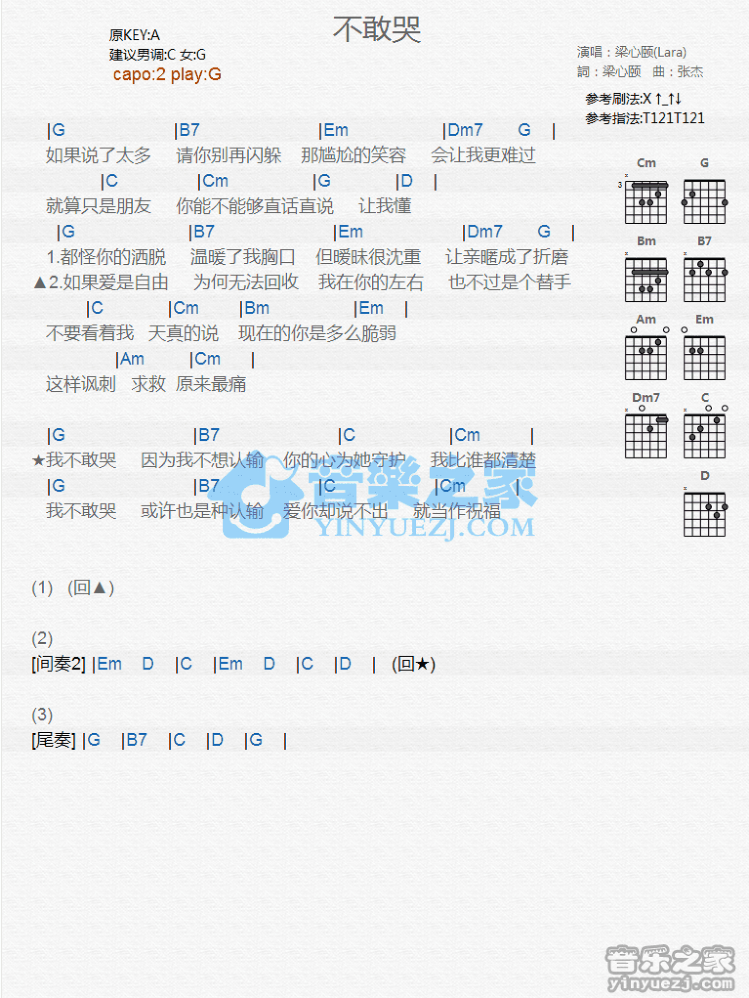 曲谱介绍: G调版梁心颐《不敢哭》吉他和弦弹唱谱