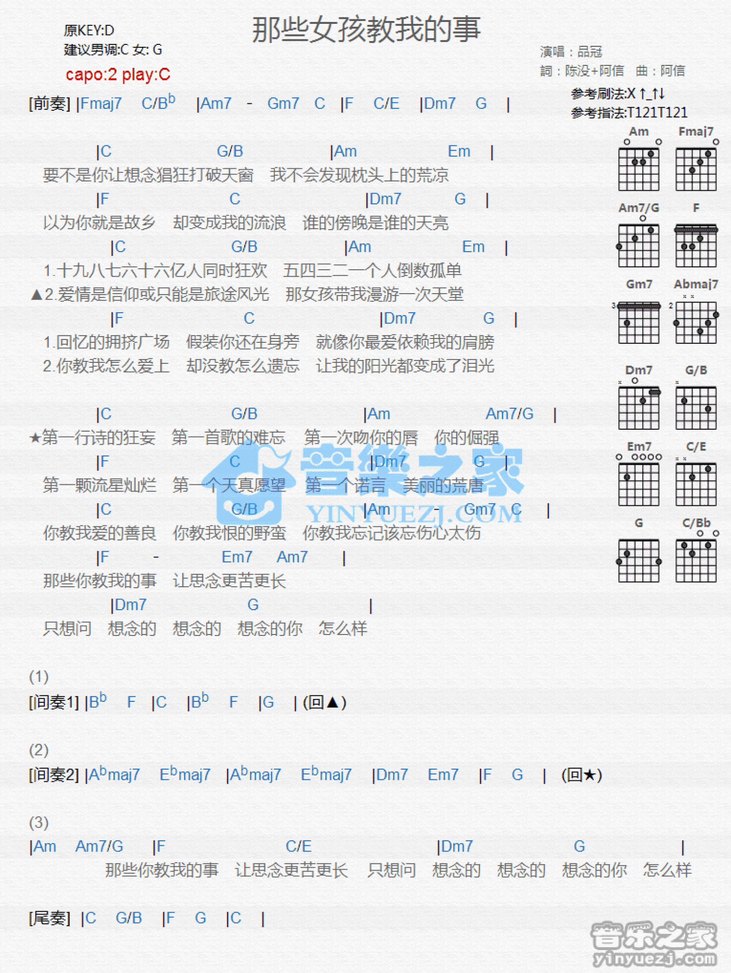 曲谱介绍: C调版品冠《那些女孩教我的事》吉他和弦弹唱谱