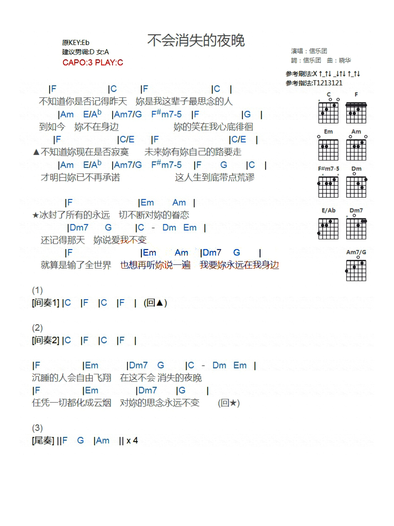 曲谱介绍: C调版信乐团《不会消失的夜晚》吉他和弦弹唱谱
