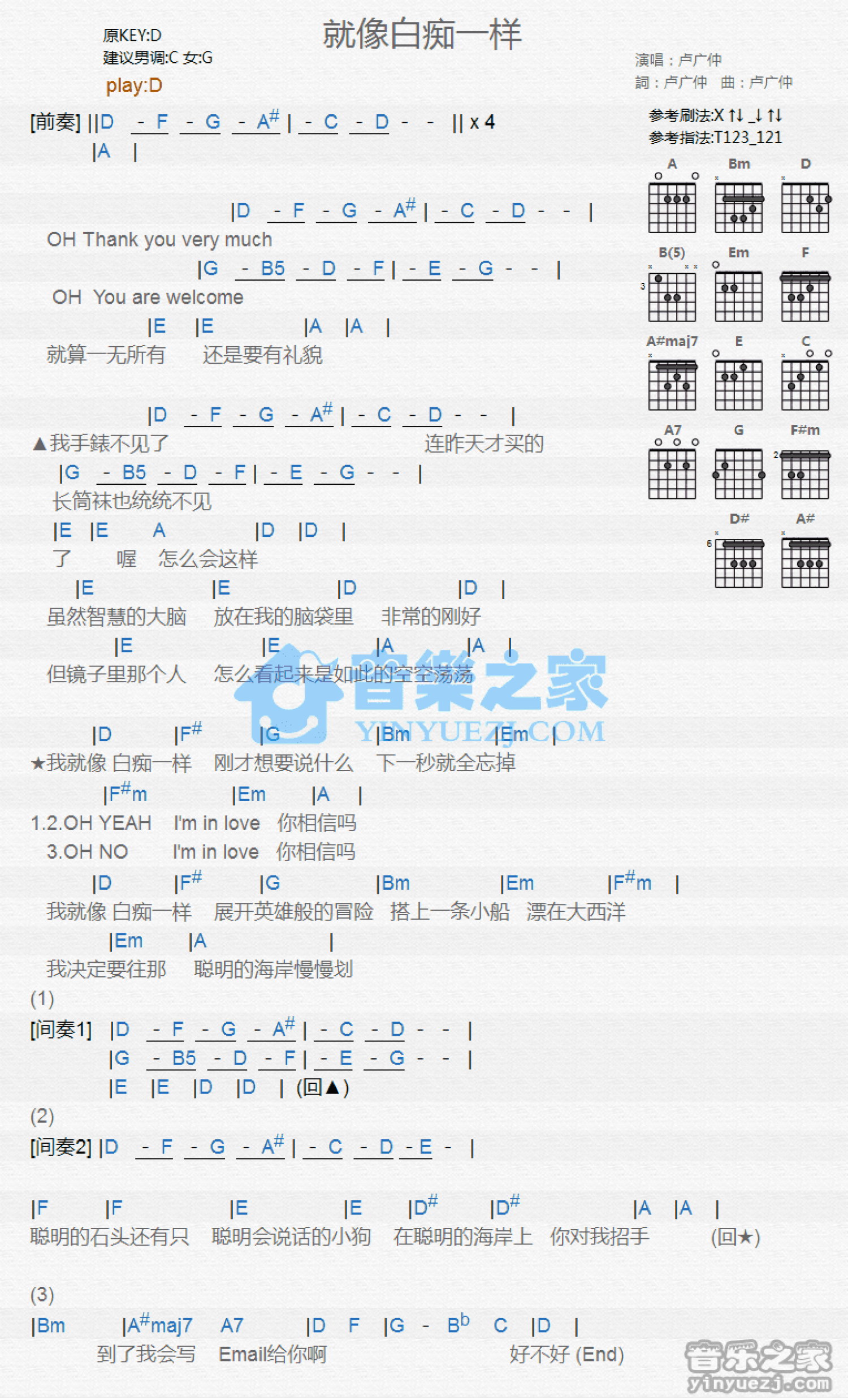 曲谱介绍: D调版卢广仲《就像白痴一样》吉他和弦弹唱谱