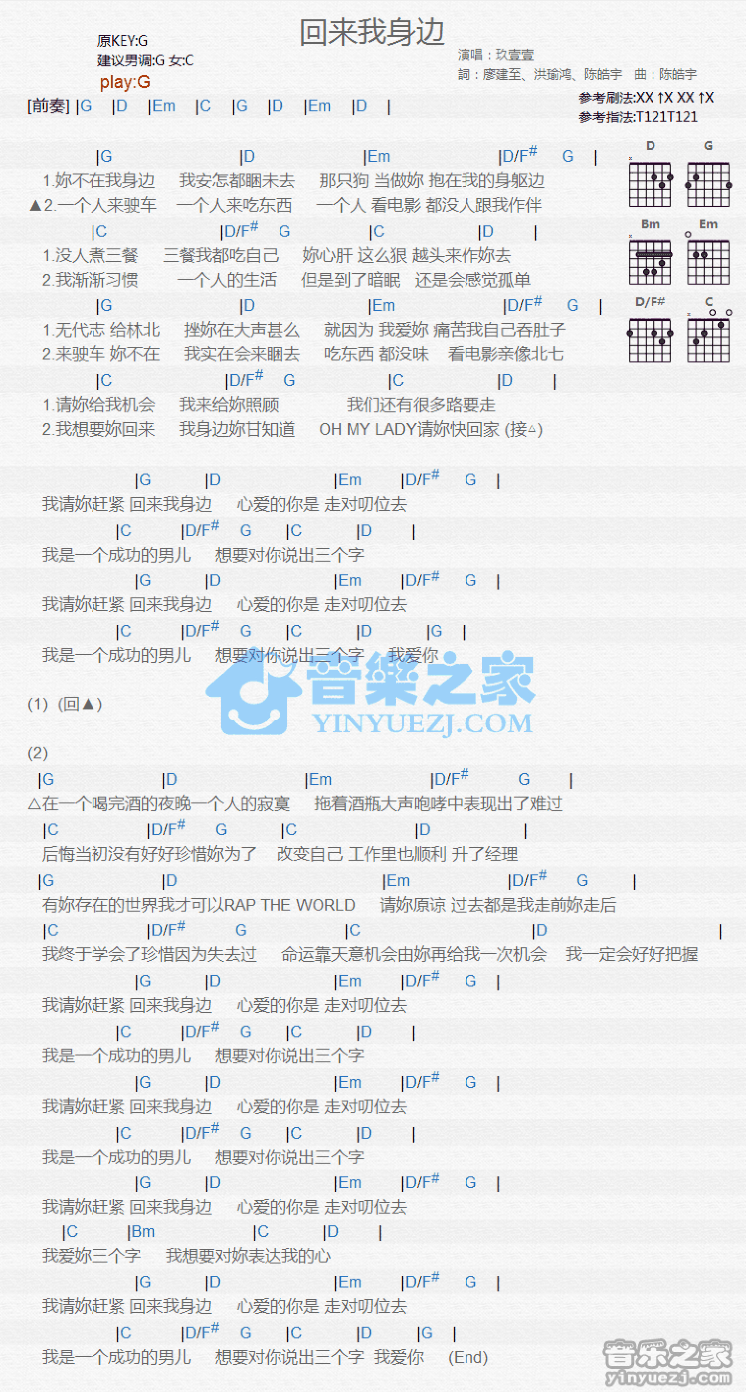 曲谱介绍: G调版玖壹壹《回来我身边》《回来我身边》吉他和弦弹唱谱