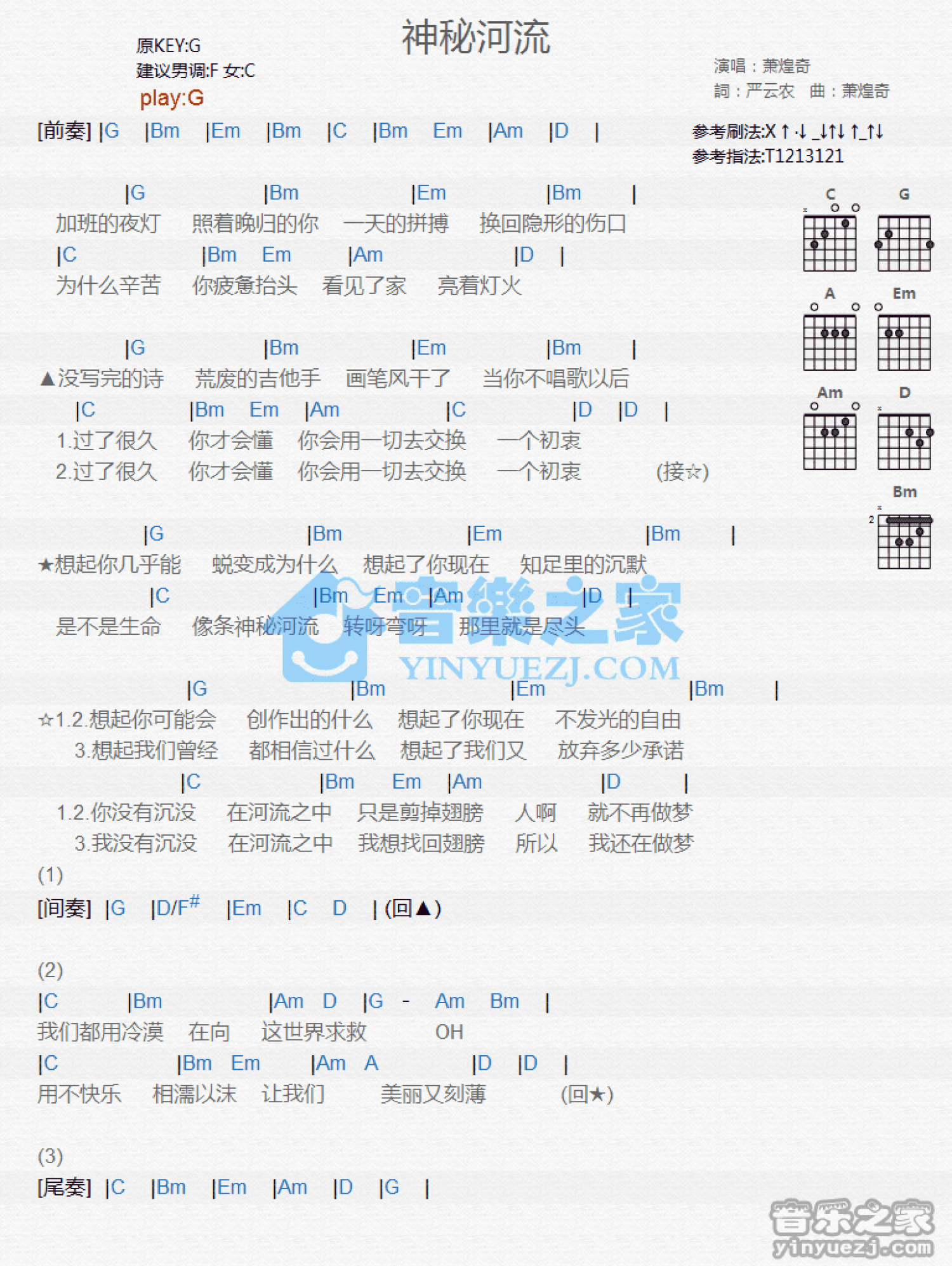 曲谱介绍: G调版《神秘河流》吉他和弦弹唱谱