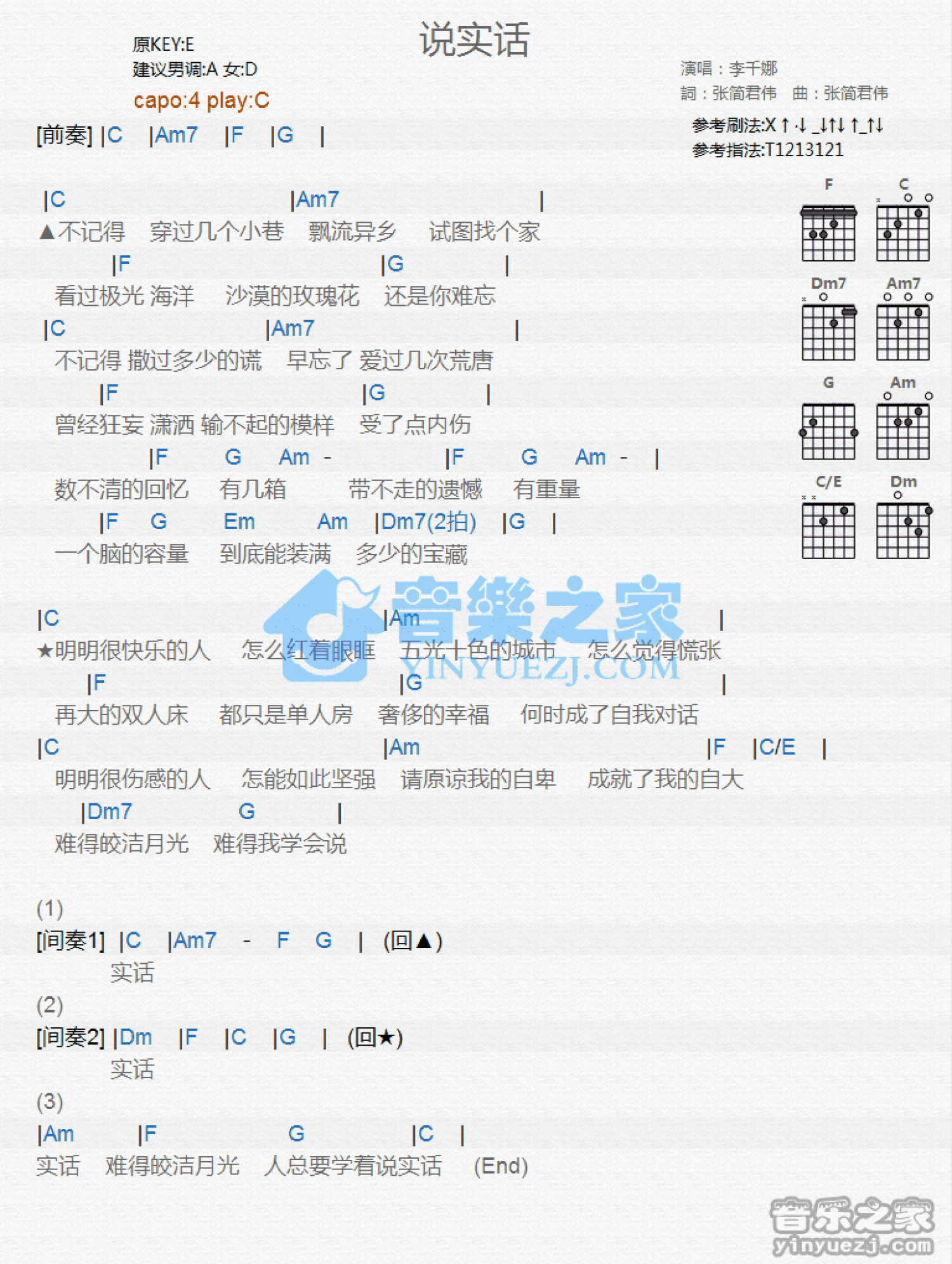 曲谱介绍: C调版李千娜《说实话》吉他和弦弹唱谱