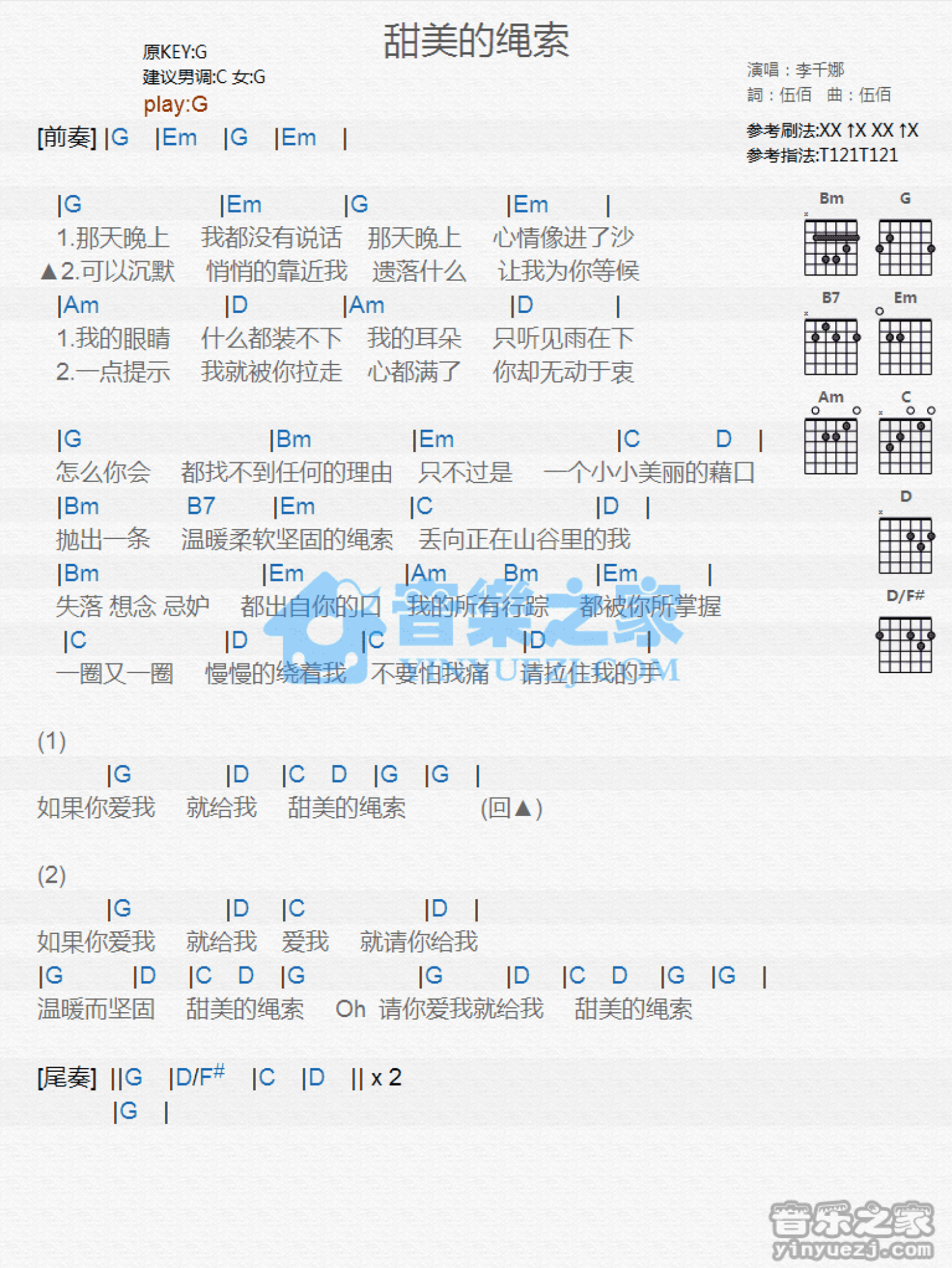 曲谱介绍: G调版李千娜《甜美的绳索》吉他和弦弹唱谱