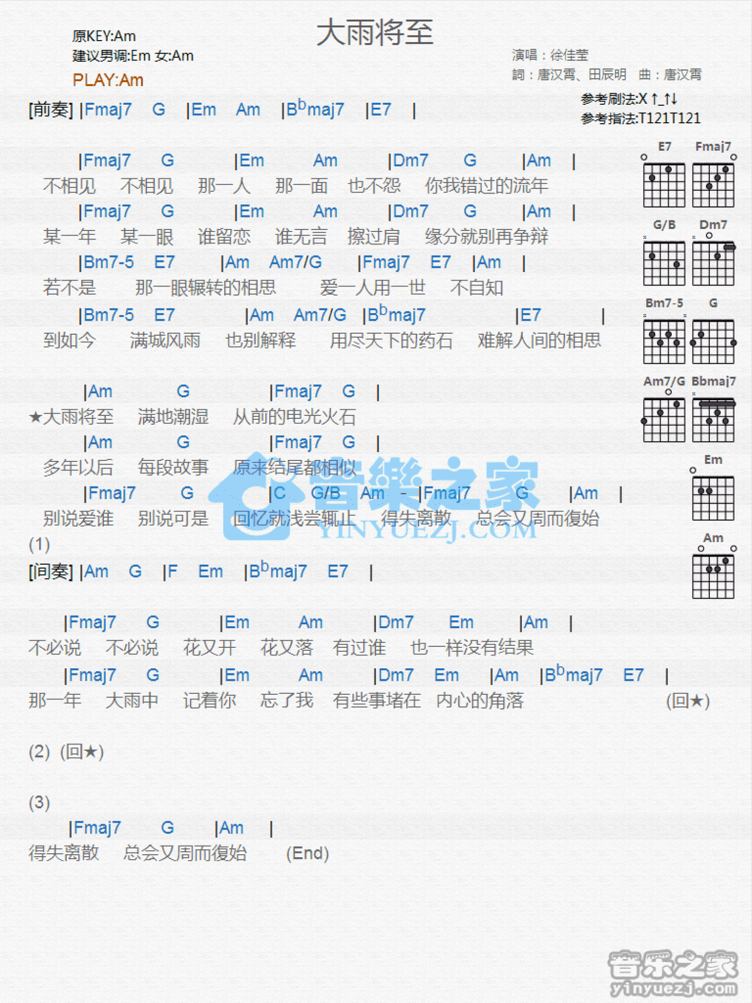 曲谱介绍: Am调版徐佳莹《大雨将至》吉他和弦弹唱谱