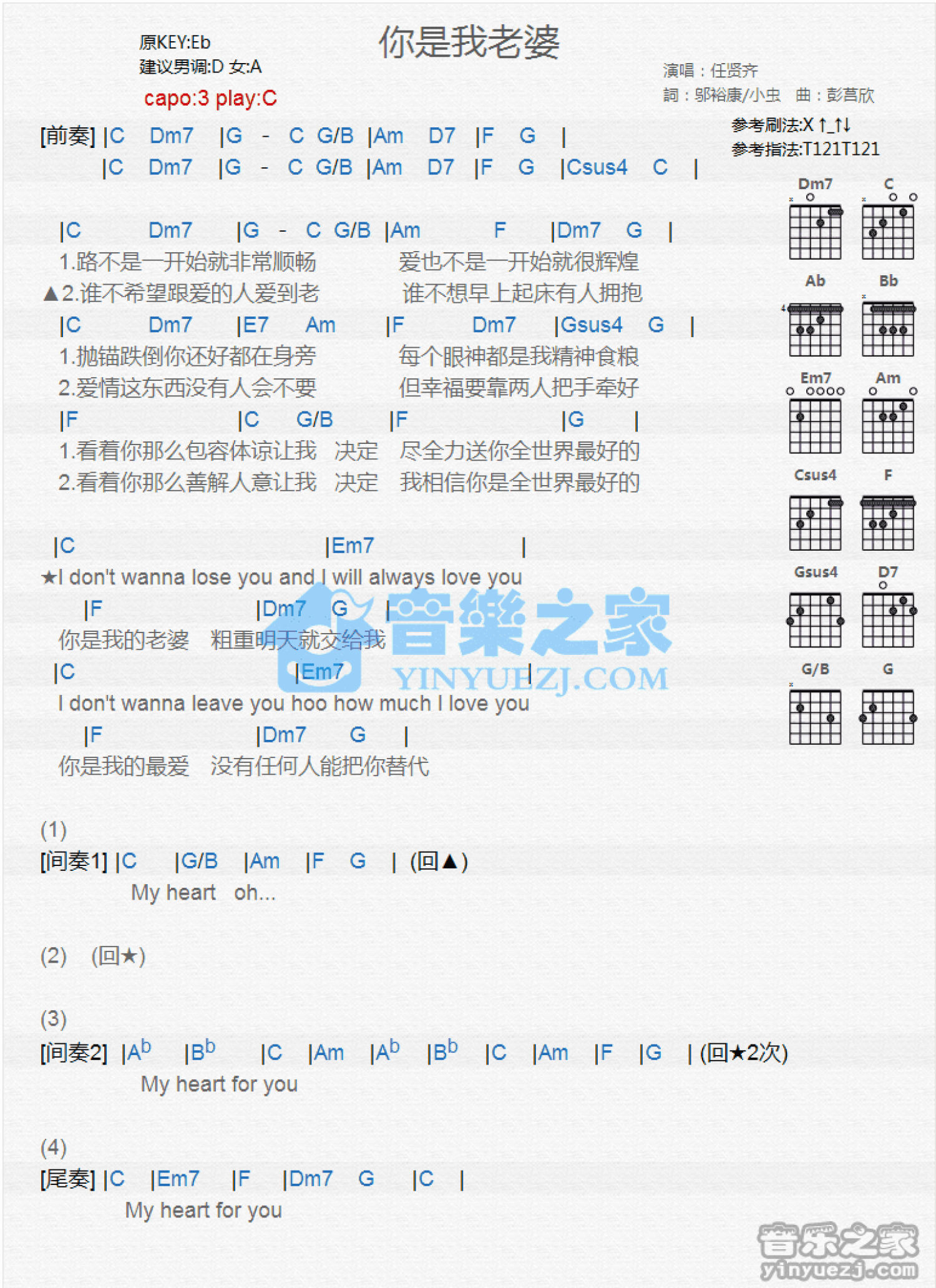 曲谱介绍: C调版《你是我老婆》吉他和弦弹唱谱