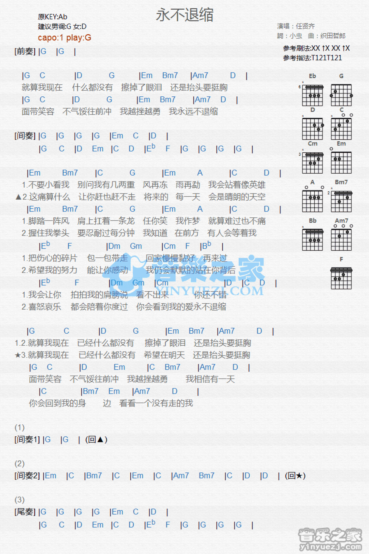 曲谱介绍: G调版《永不退缩》吉他和弦弹唱谱