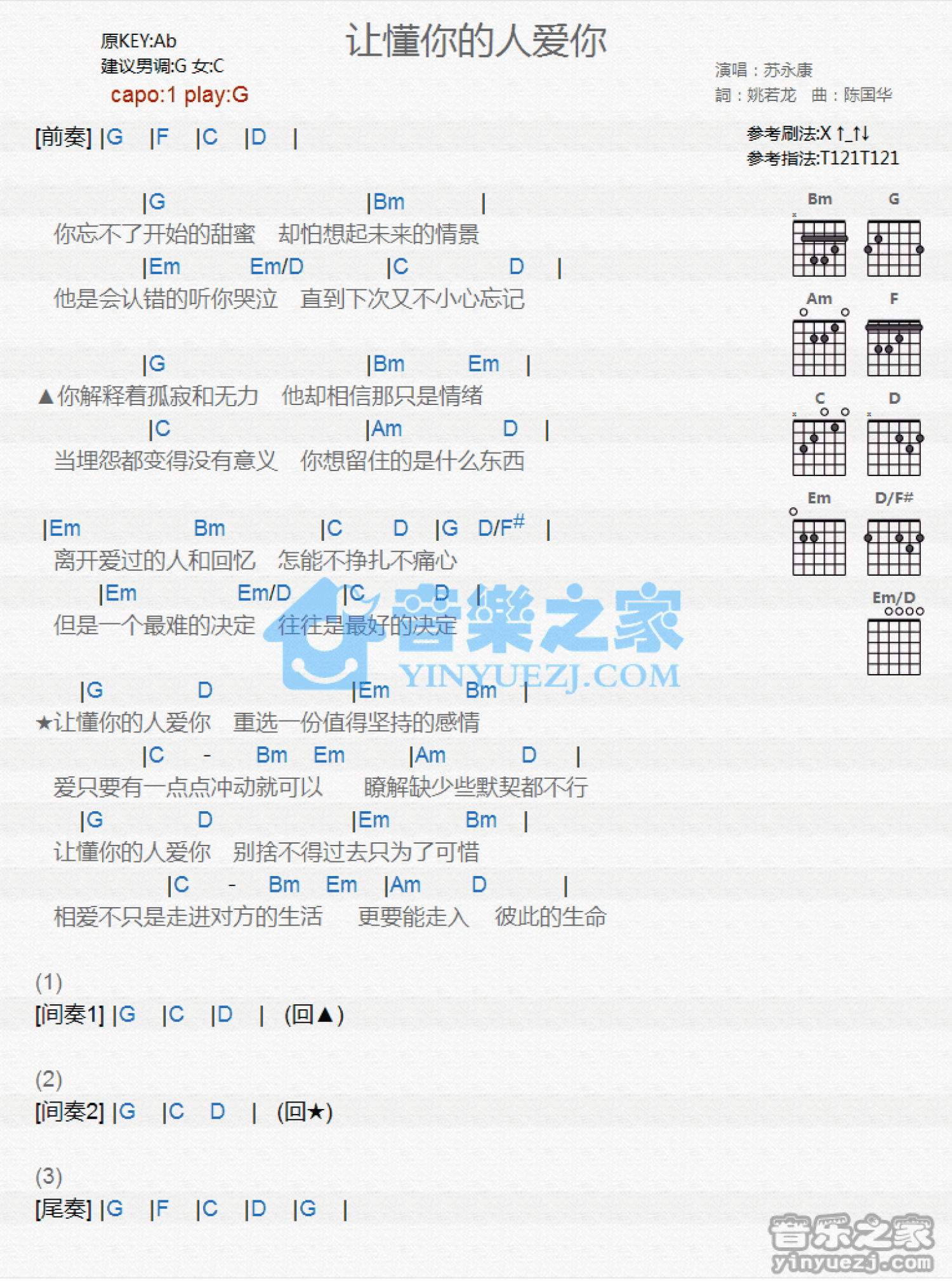曲谱介绍: G调版 苏永康《让懂你的人爱你》吉他和弦弹唱谱