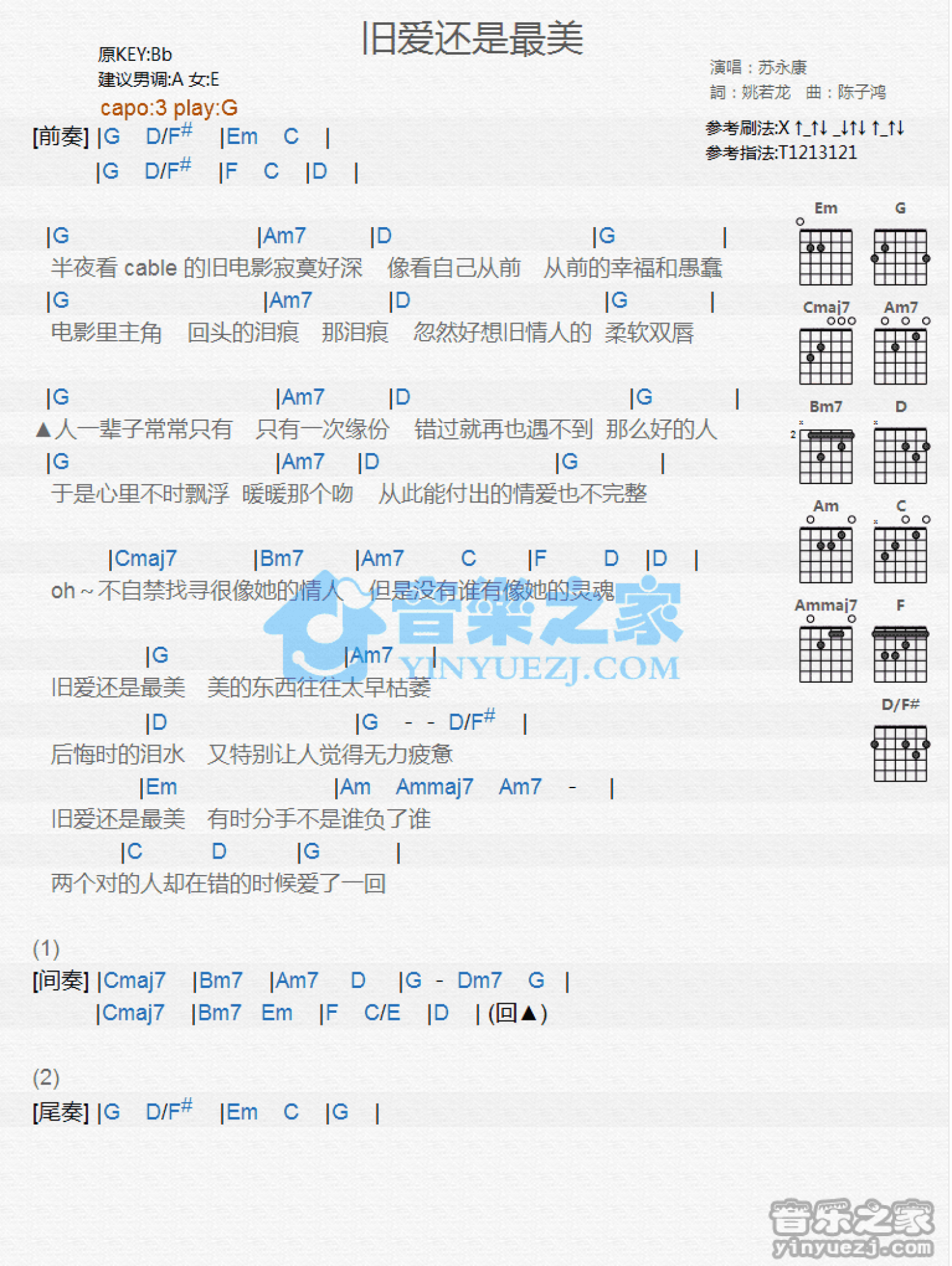 曲谱介绍: G调版苏永康《旧爱还是最美》吉他和弦弹唱谱