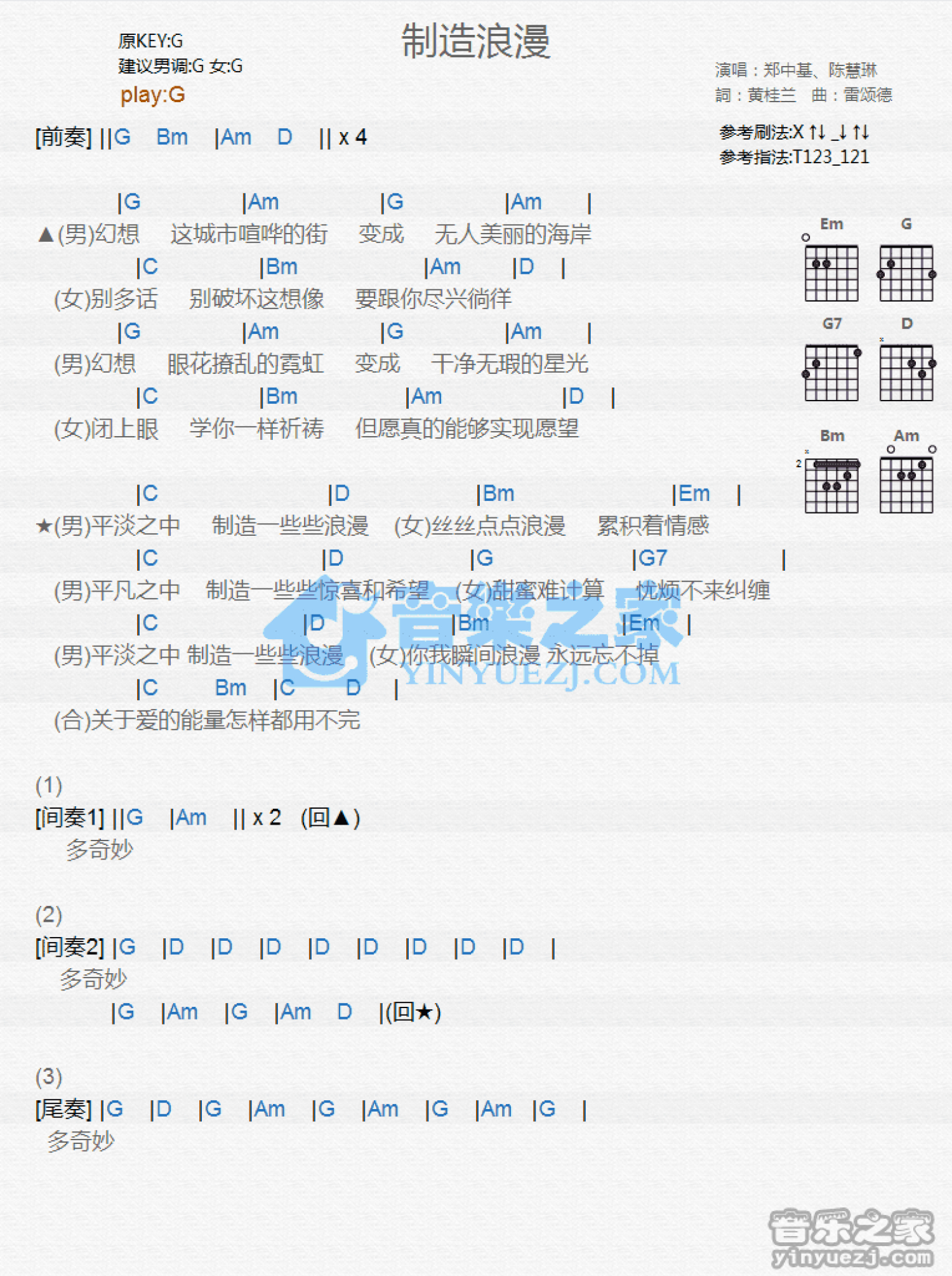 曲谱介绍: G调版郑中基/陈慧琳《制造浪漫》吉他和弦弹唱谱