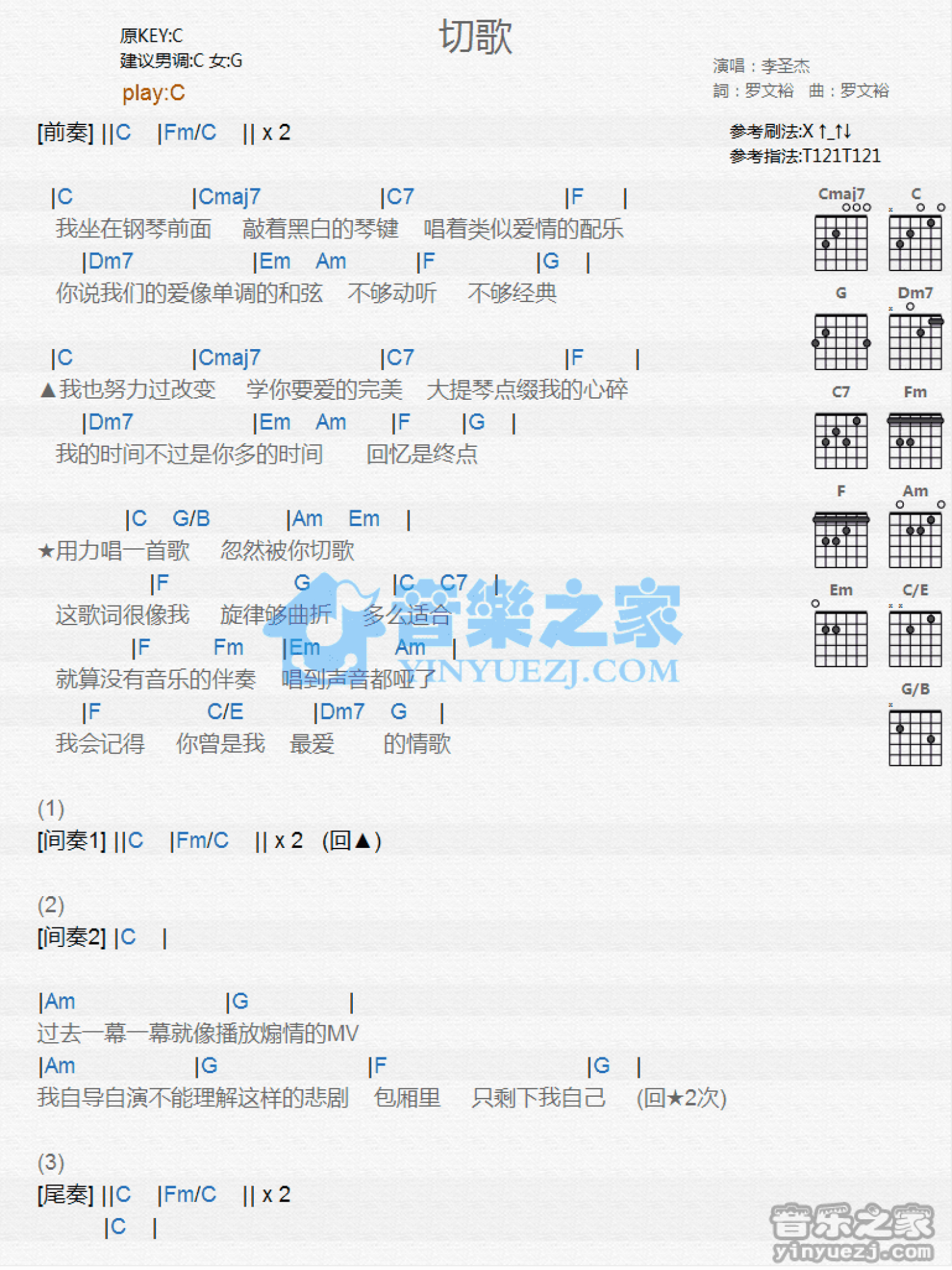 曲谱介绍: C调版李圣杰《切歌》吉他和弦弹唱谱