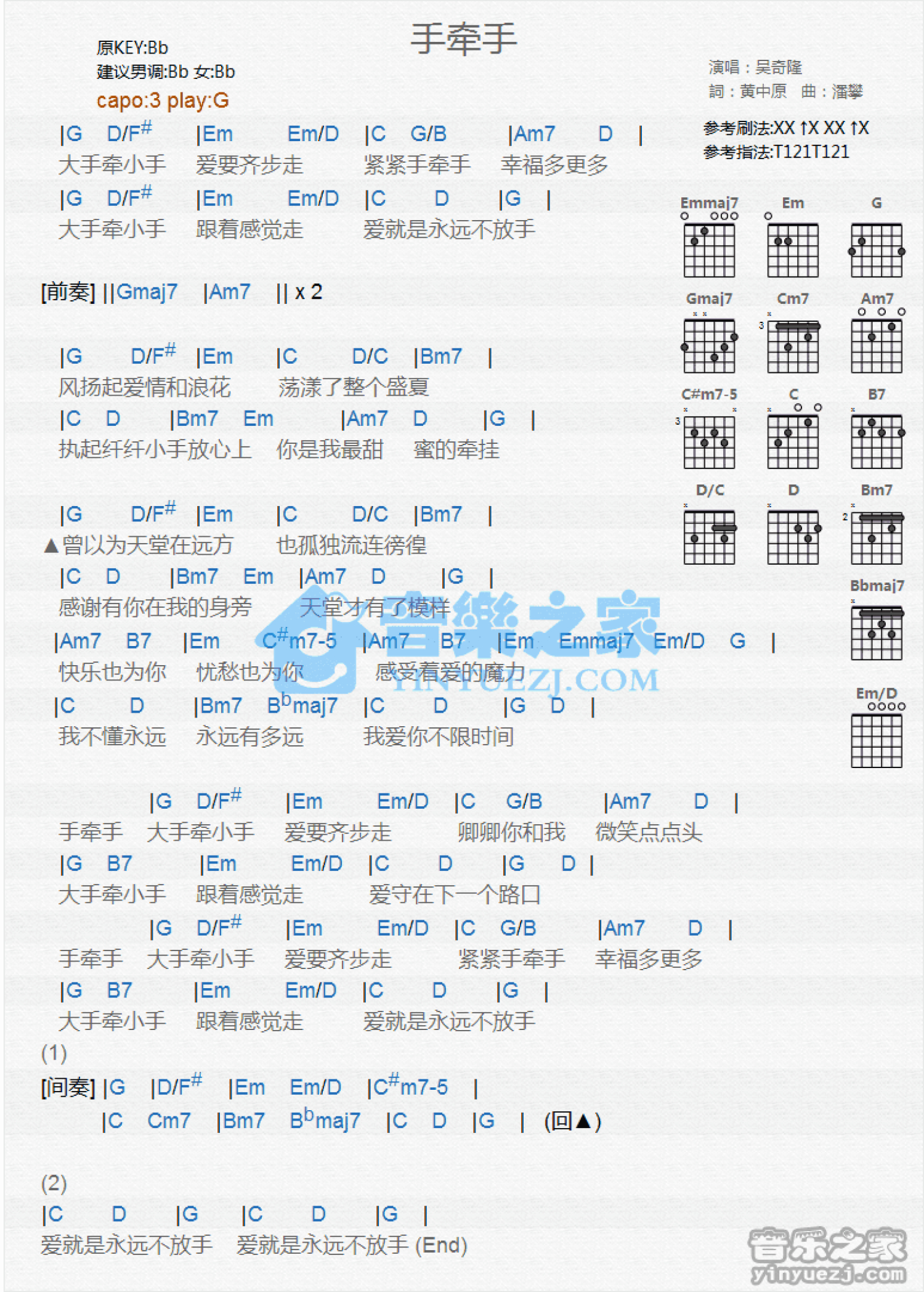 曲谱介绍: G调版《手牵手》吉他和弦弹唱谱