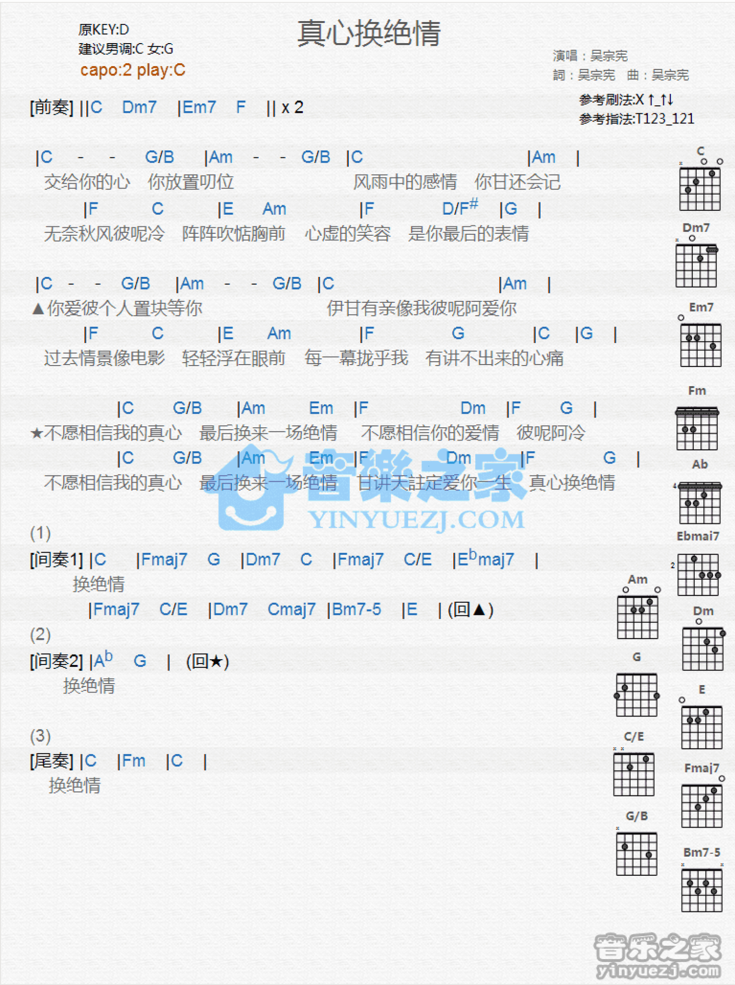 曲谱介绍: C调版吴宗宪《真心换绝情》吉他和弦弹唱谱