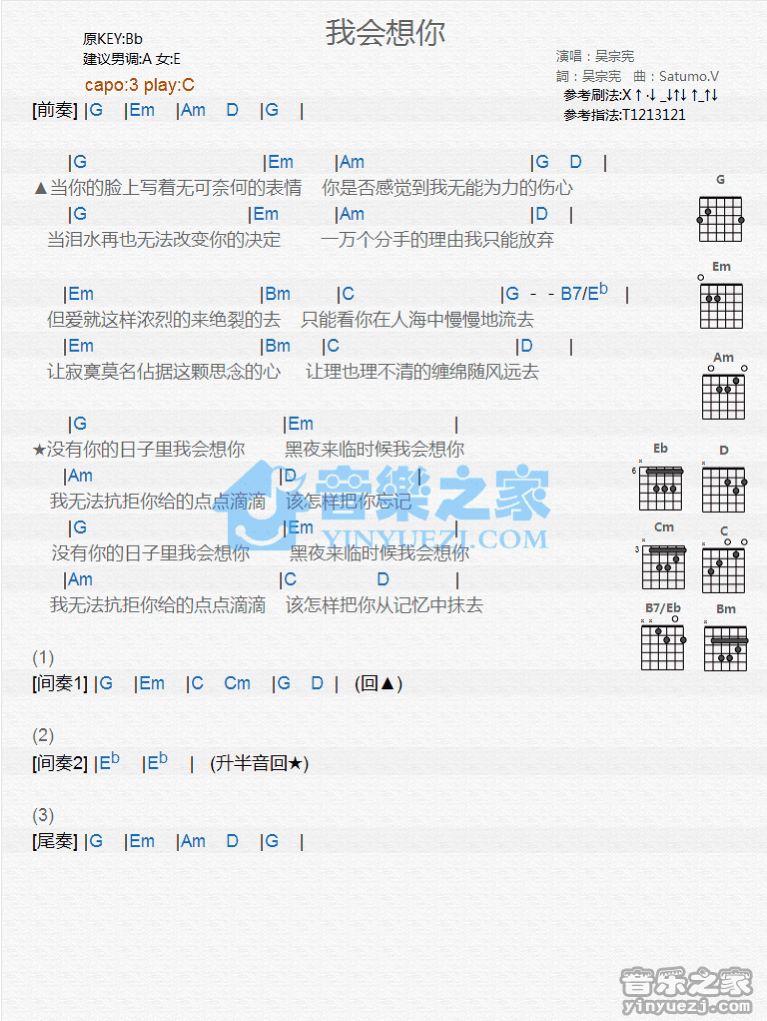 曲谱介绍: C调版吴宗宪《我会想你》吉他和弦弹唱谱