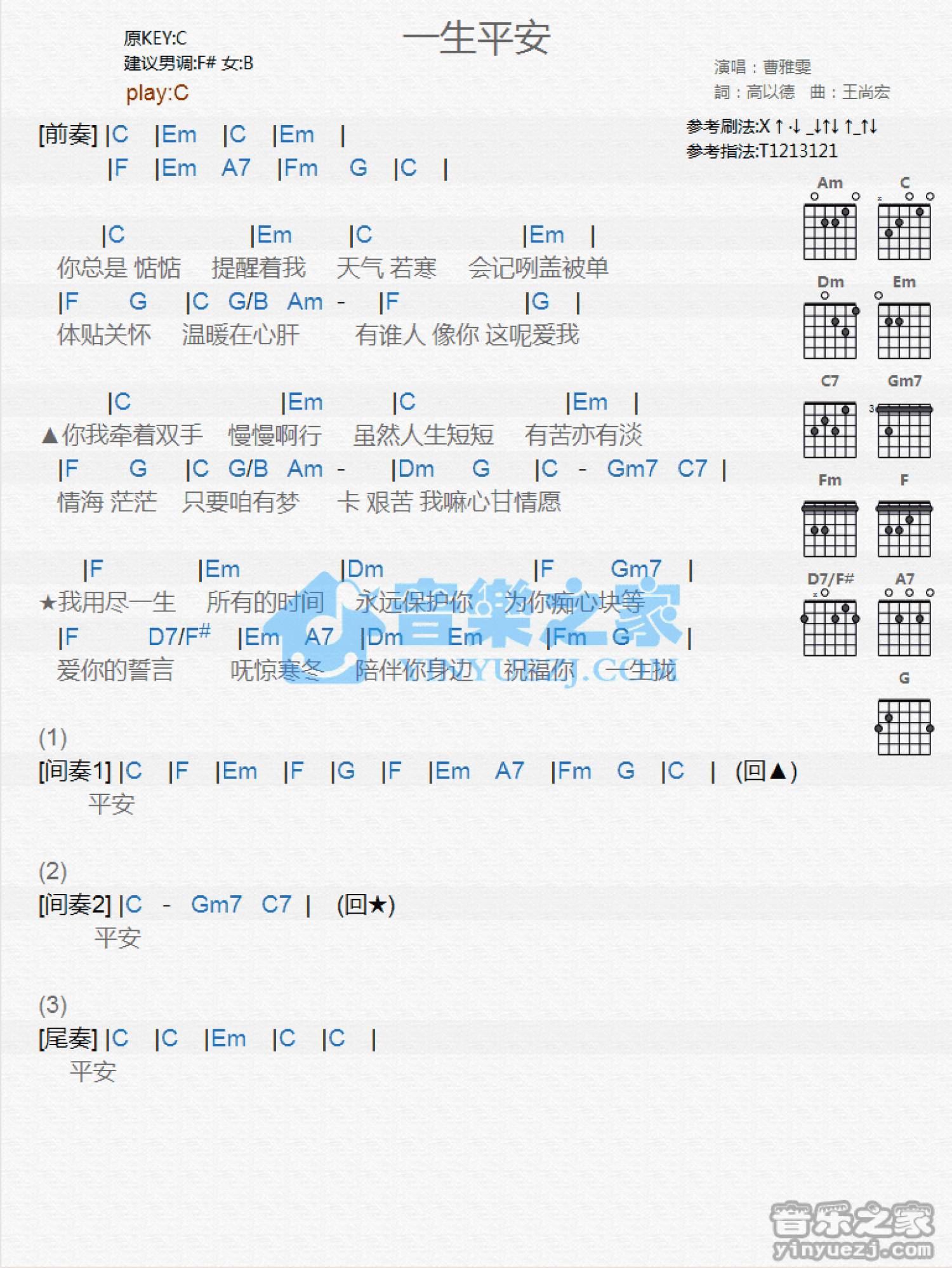 曲谱介绍: C调版曹雅雯《一生平安》吉他和弦弹唱谱