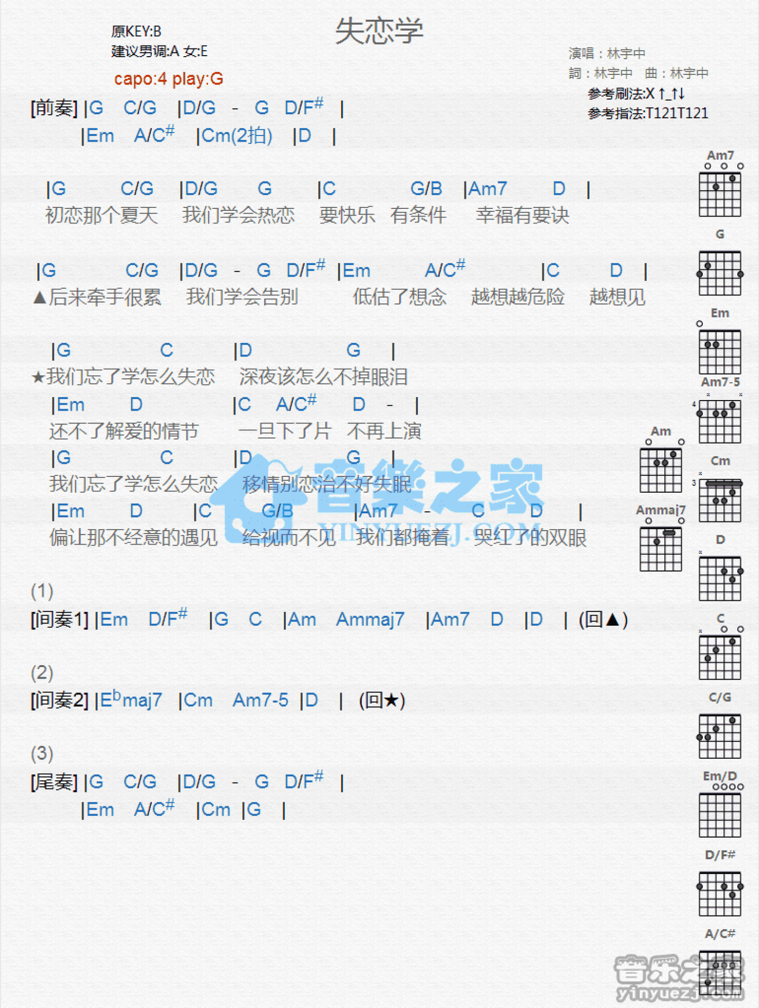 曲谱介绍: G调版林宇中《失恋学》吉他和弦弹唱谱