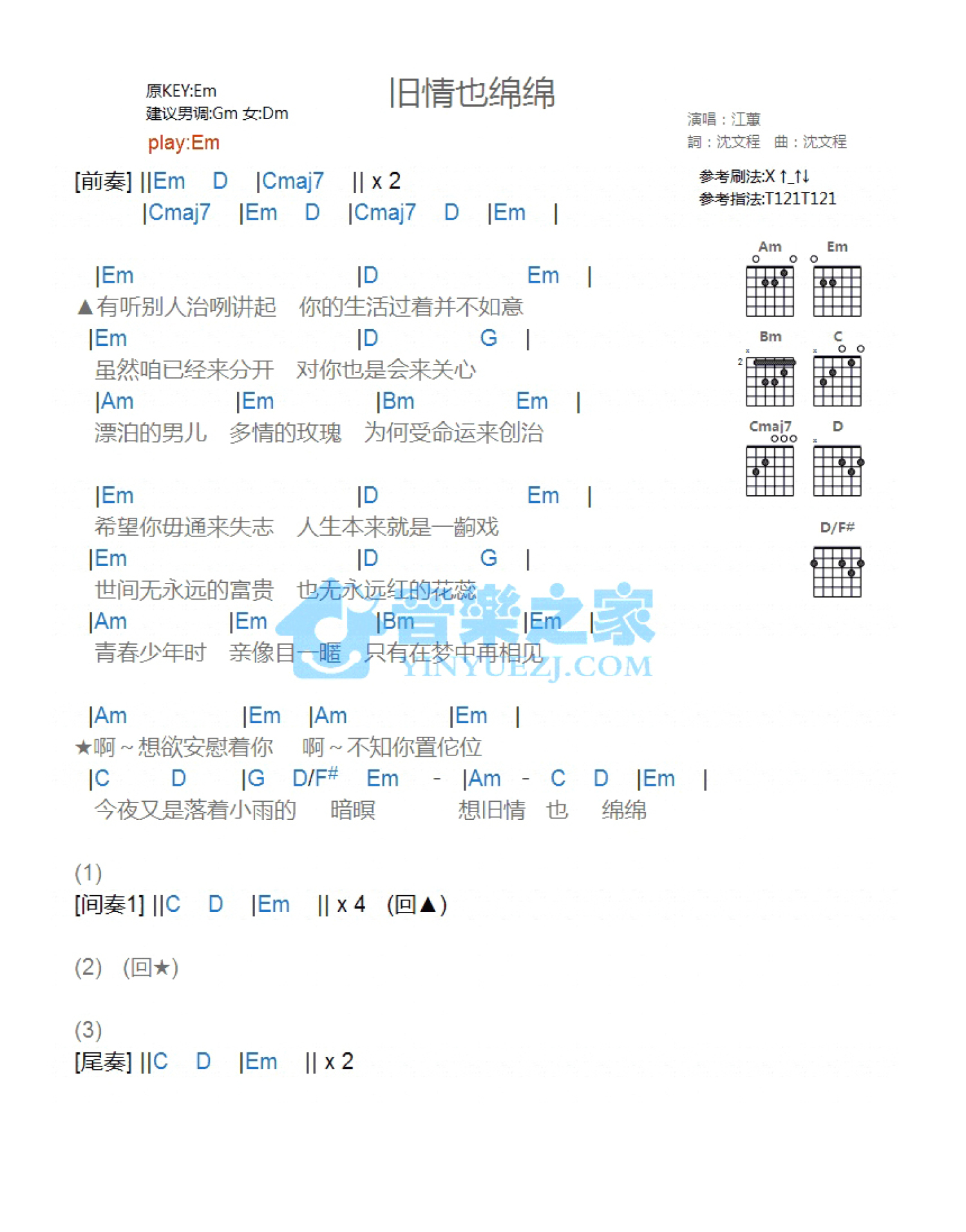 曲谱介绍: Em调版江蕙《旧情也绵绵》吉他和弦弹唱谱