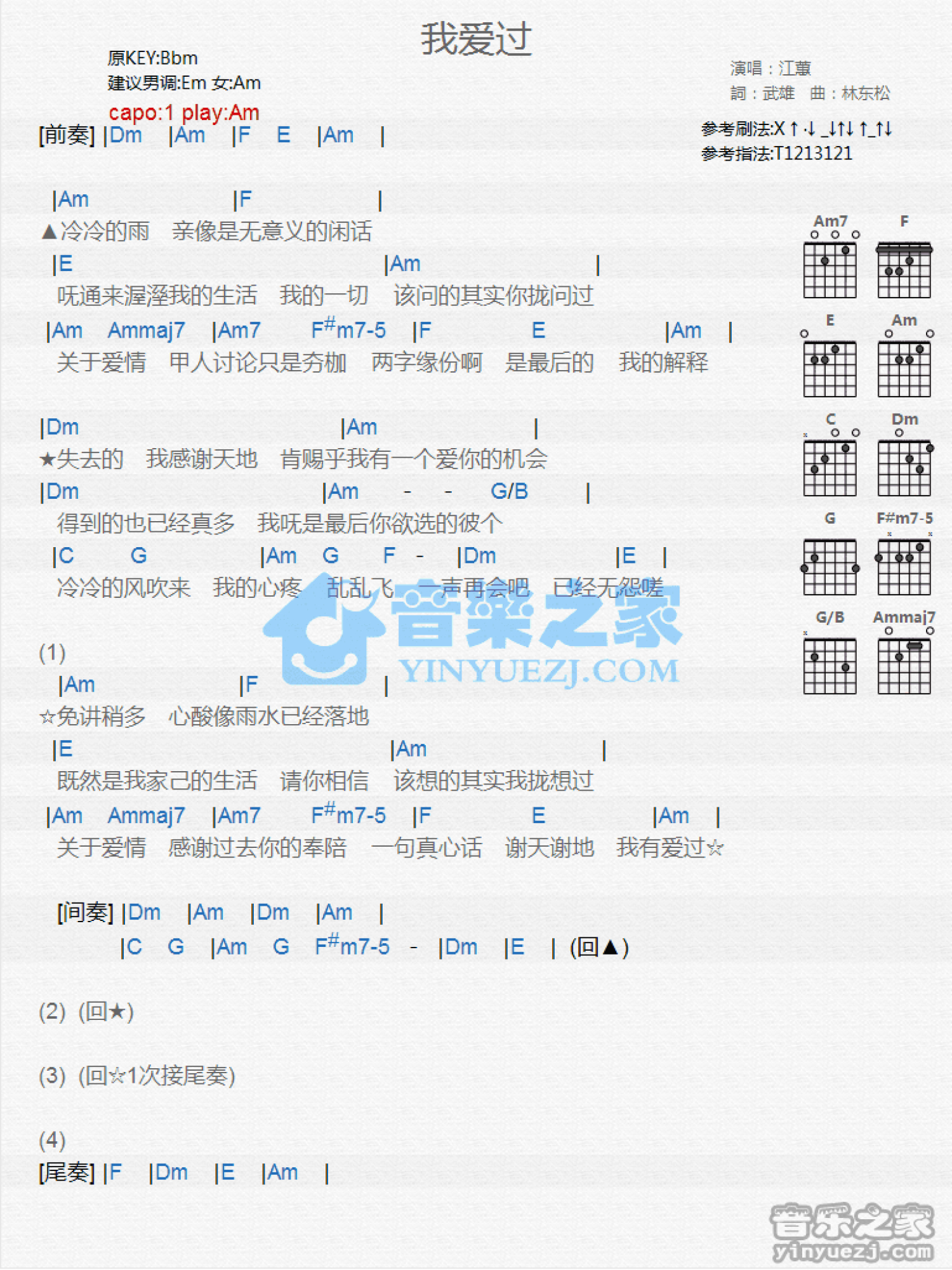 曲谱介绍: Am调版江蕙《我爱过》吉他和弦弹唱谱