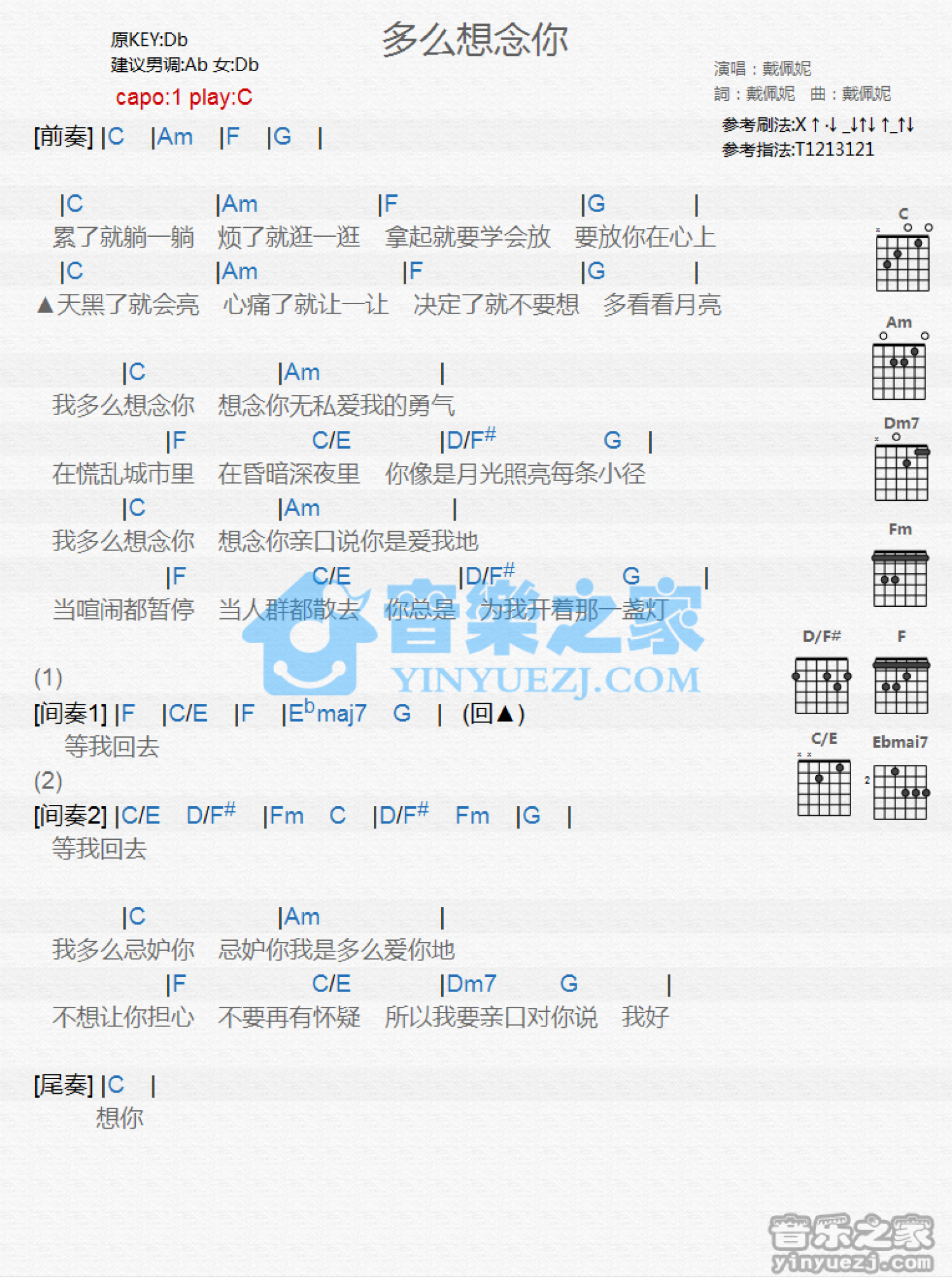 曲谱介绍: C调版 戴佩妮《多么想念你》吉他和弦弹唱谱