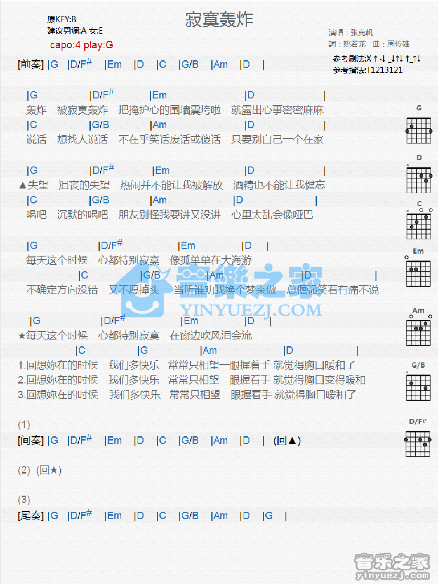 曲谱介绍: G调版 张克帆《寂寞轰炸》吉他和弦弹唱谱