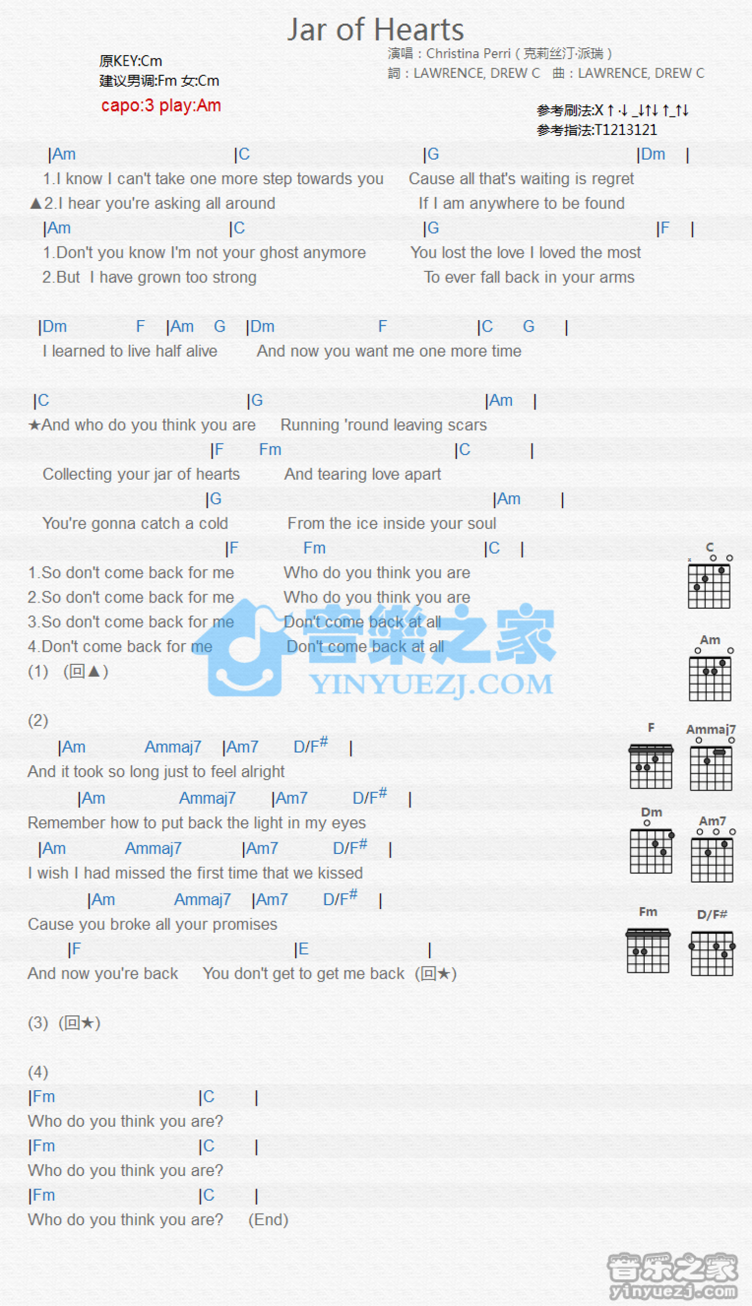曲谱介绍: Am调版 Christina Perri《Jar of Hearts》吉他和弦弹唱谱