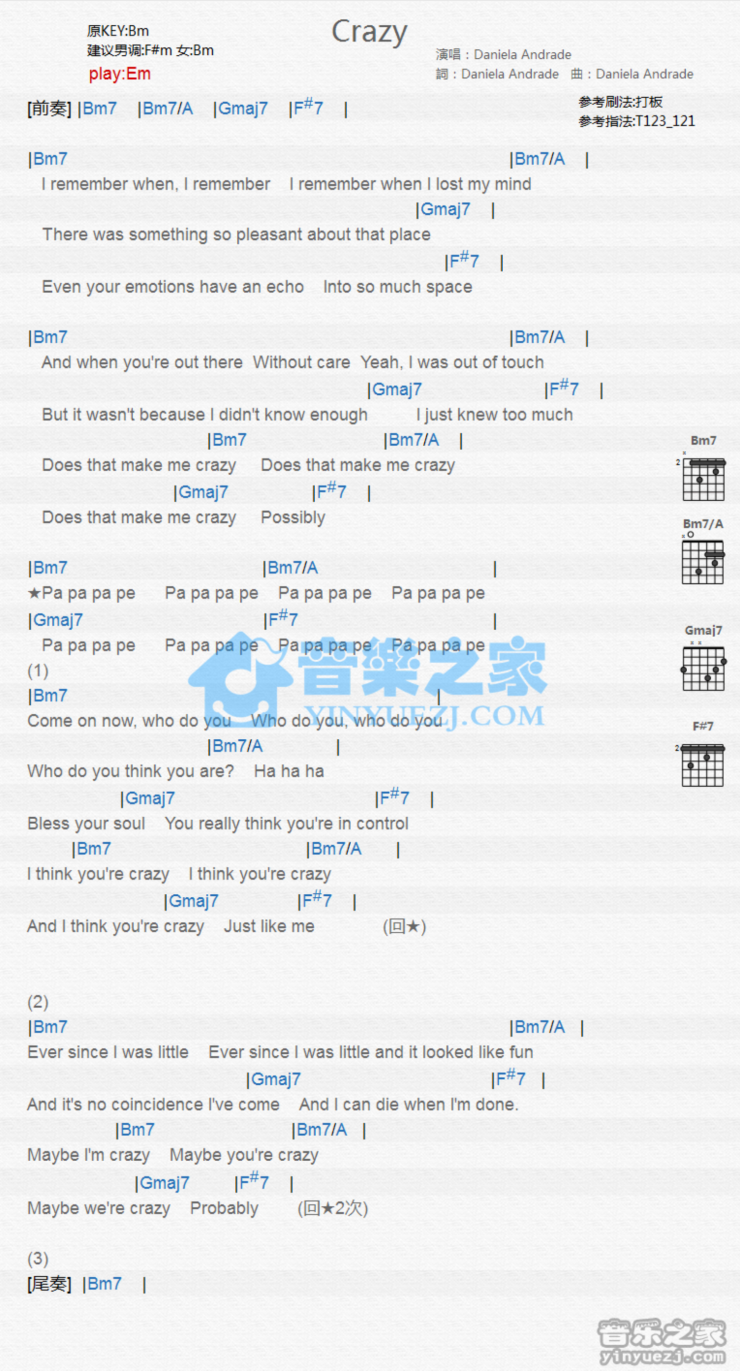 曲谱介绍: Em调版 Daniela Andrade《Crazy》吉他和弦弹唱谱