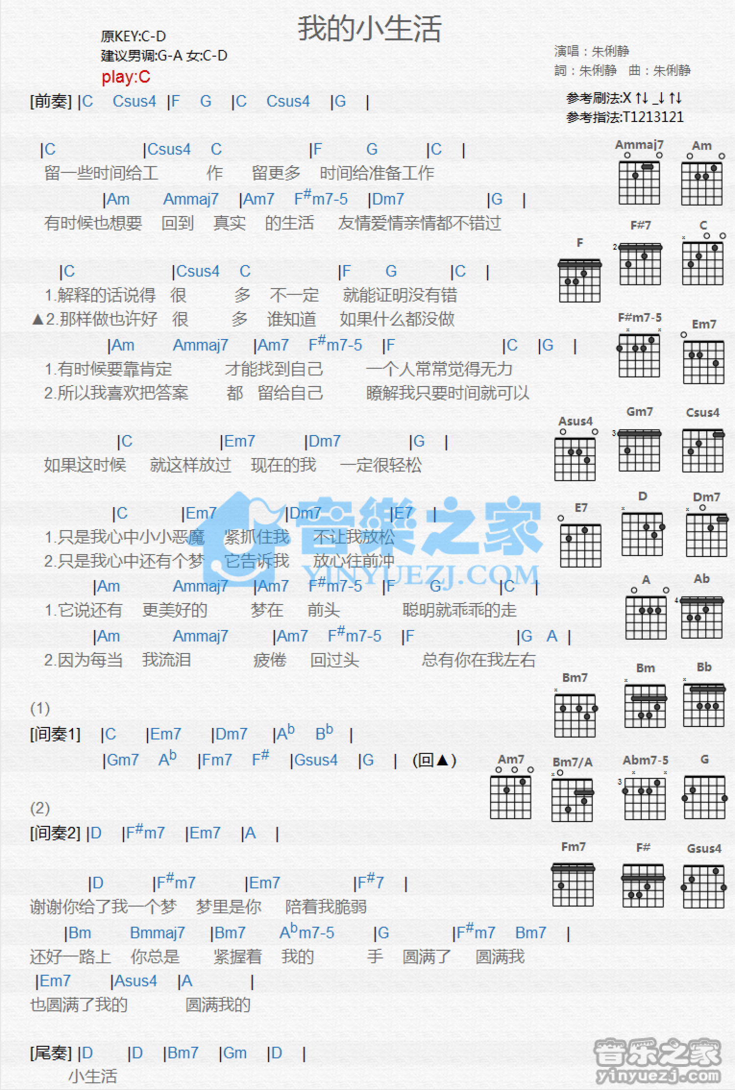 曲谱介绍: C调版 朱俐静《我的小生活》吉他和弦弹唱谱