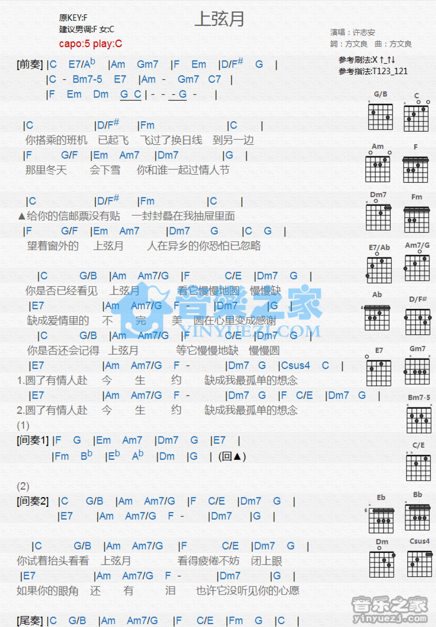 曲谱介绍: C调版 许志安《上玄月》吉他和弦弹唱谱