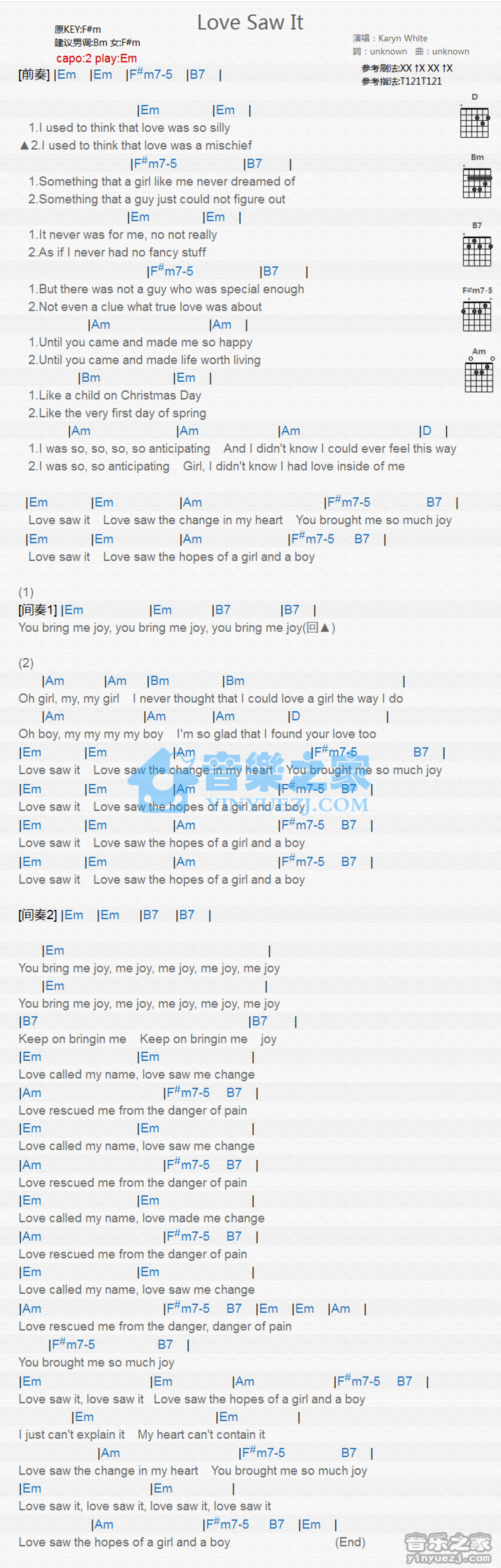 曲谱介绍: Em调版 Karyn White《Love Saw It》吉他和弦弹唱谱
