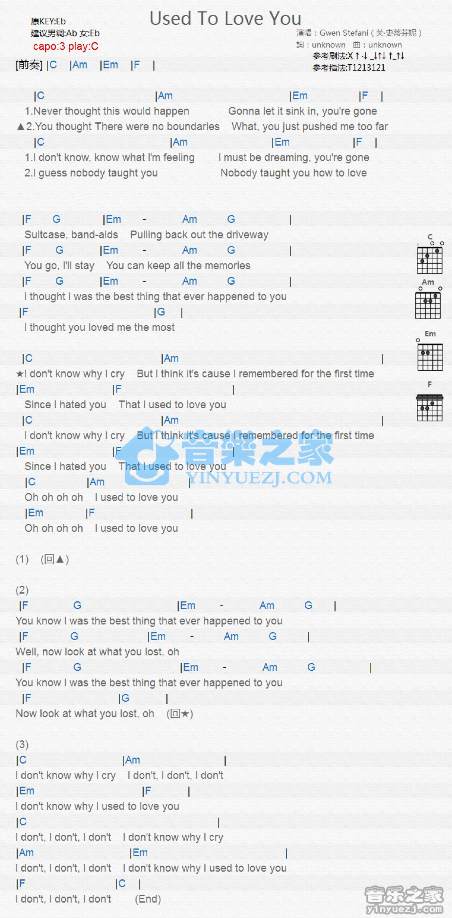 曲谱介绍: C调版 Gwen Stefani《Used to Love You》吉他和弦弹唱谱