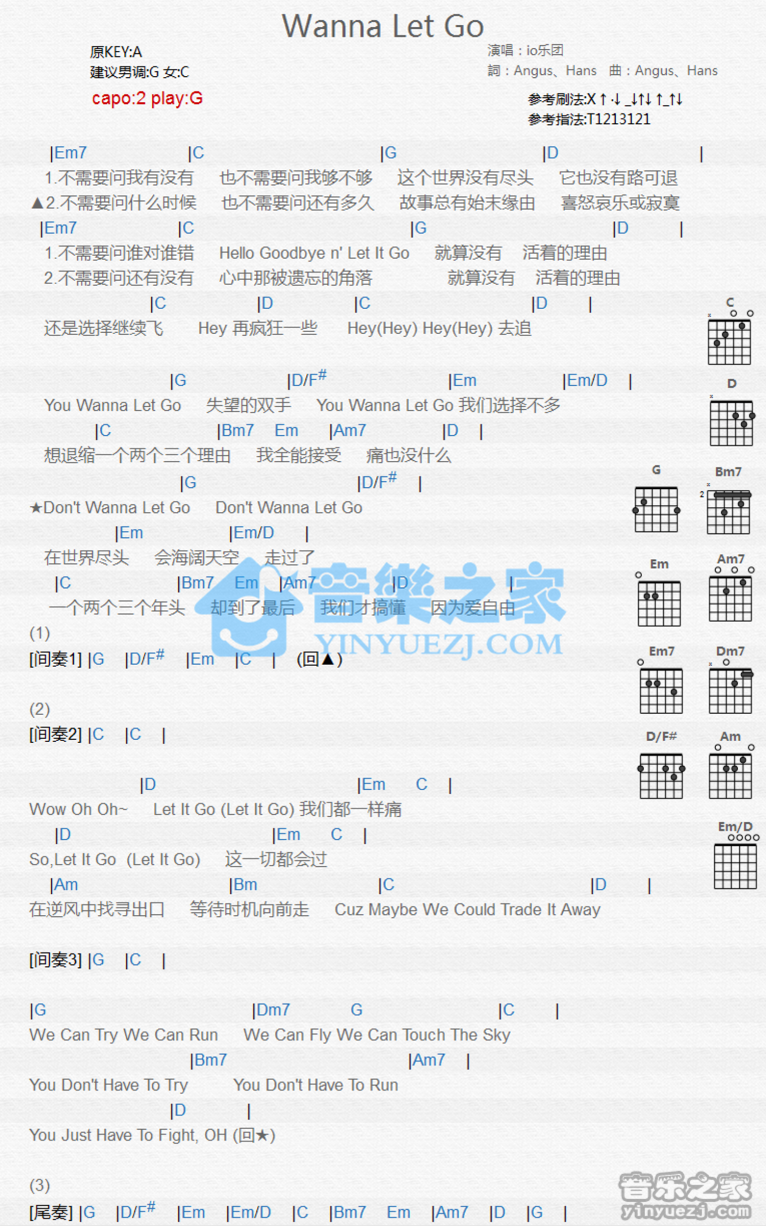 曲谱介绍: G调版 io乐团《Wanna Let Go》吉他和弦弹唱谱