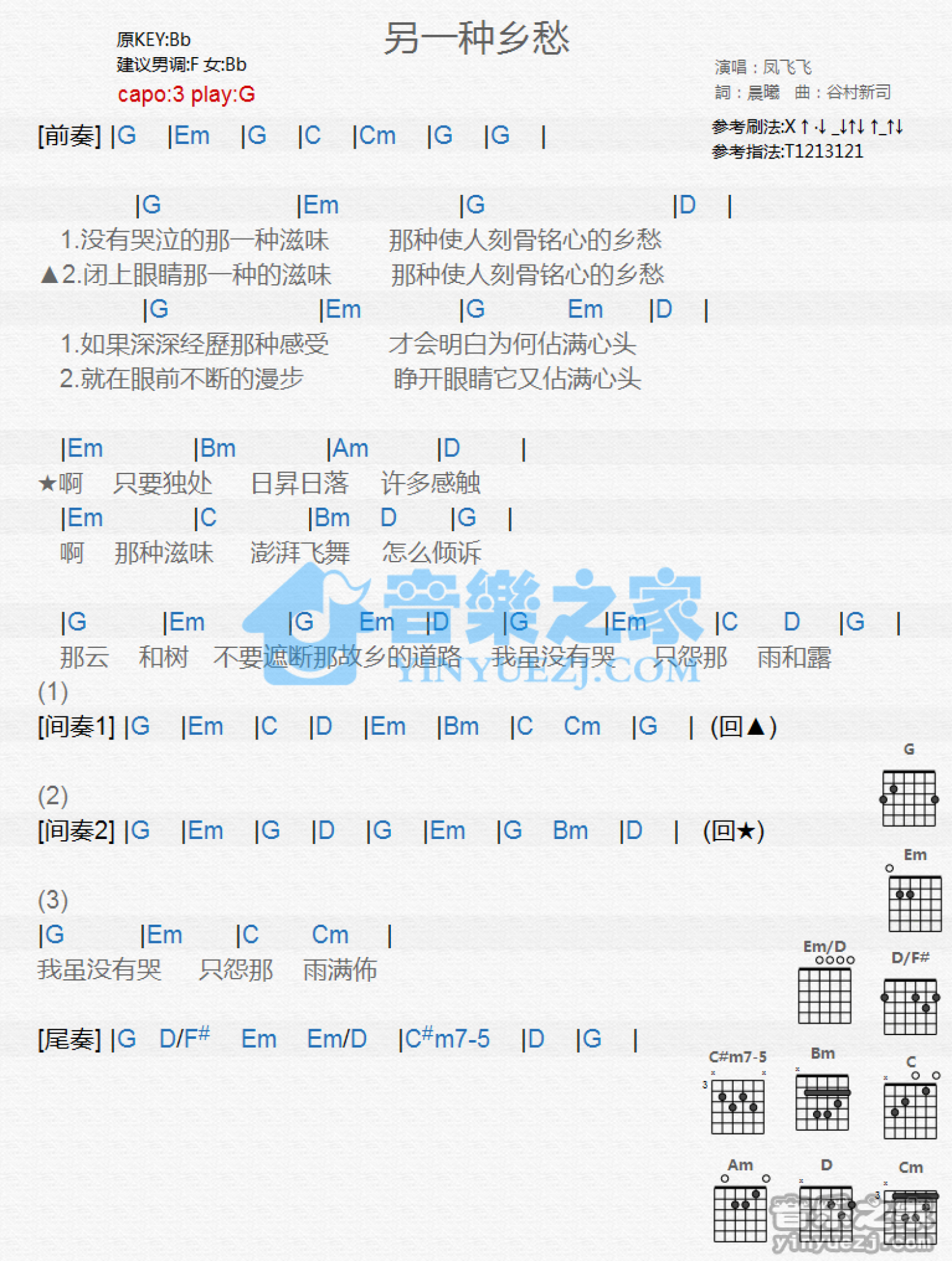 曲谱介绍: G调版《另一种乡愁》吉他和弦弹唱谱