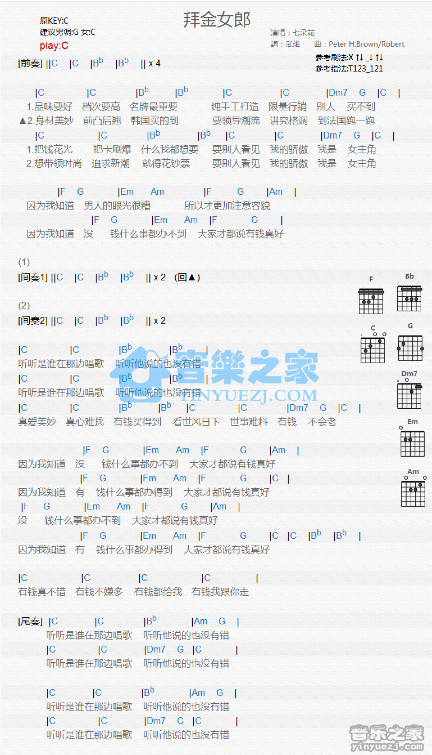 曲谱介绍: C调版 七朵花《拜金女郎》吉他和弦弹唱谱